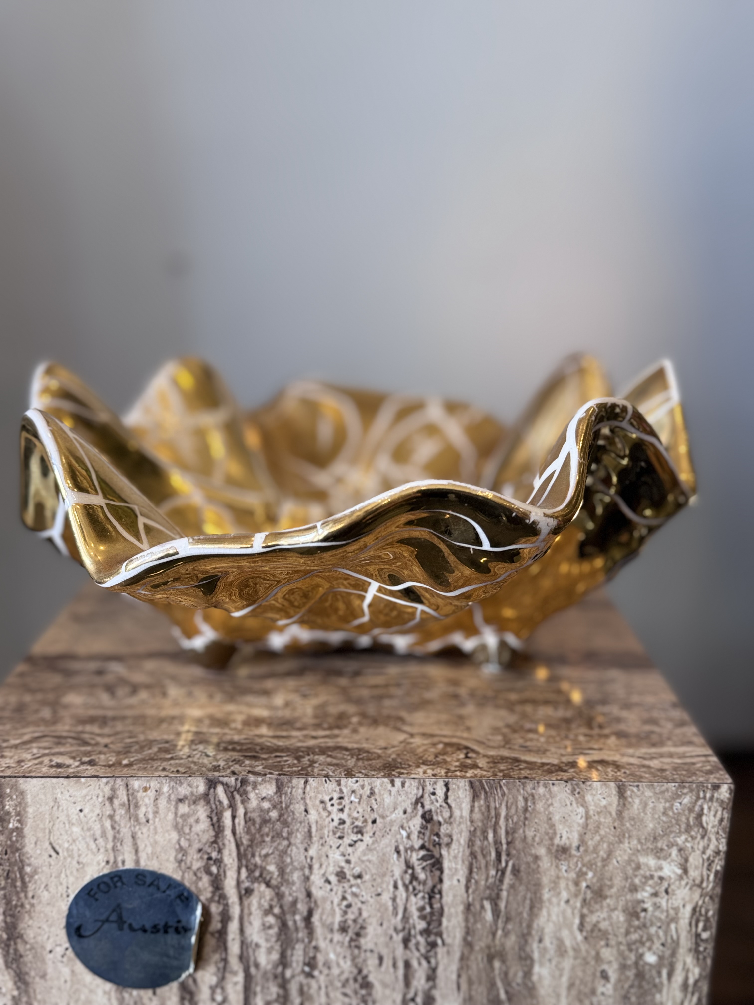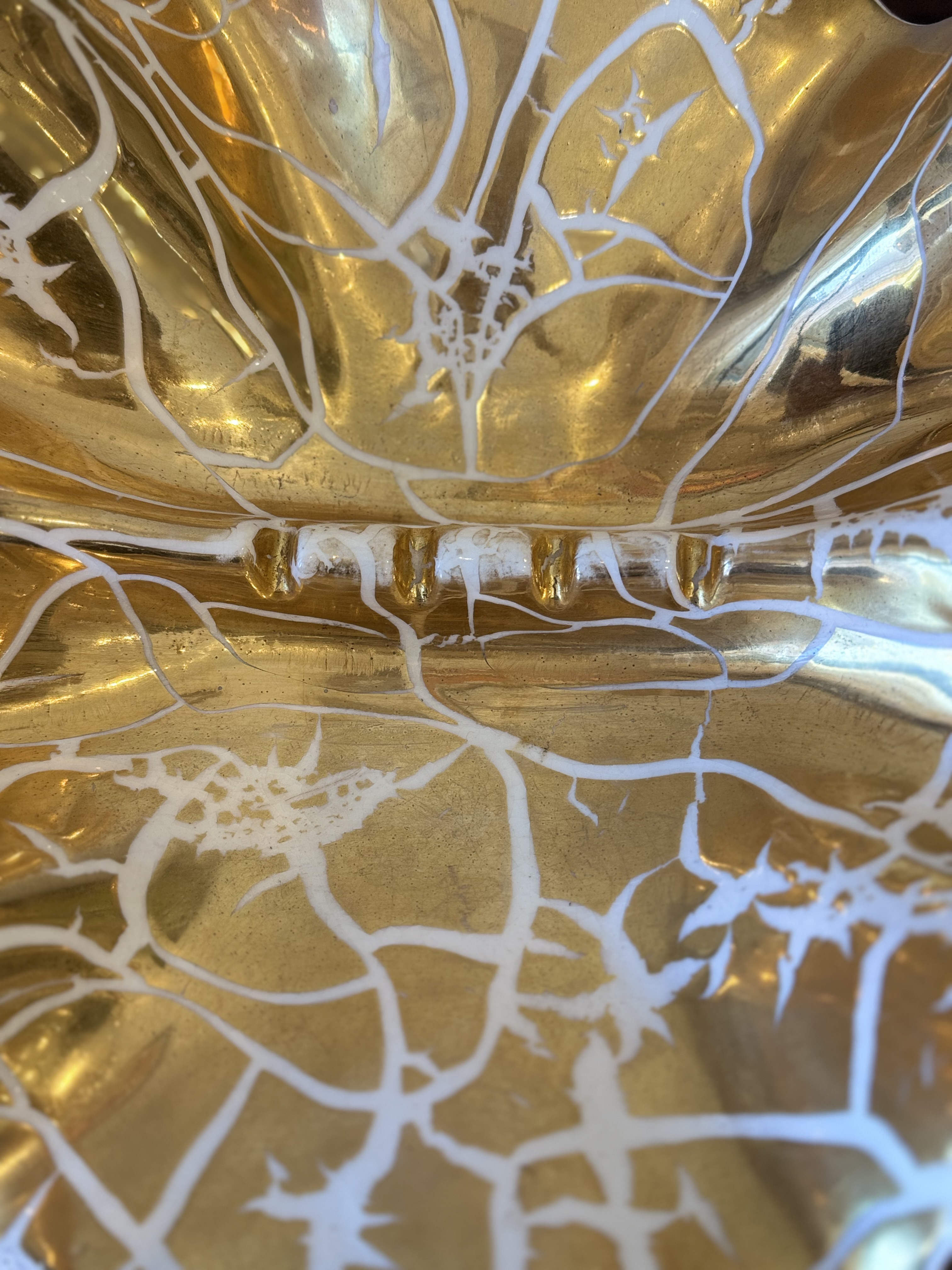 Absolutely stunning oversized ashtray here with a crackled gold glaze and clam design. Never seen one like it! Would be a great accent piece in any space:)