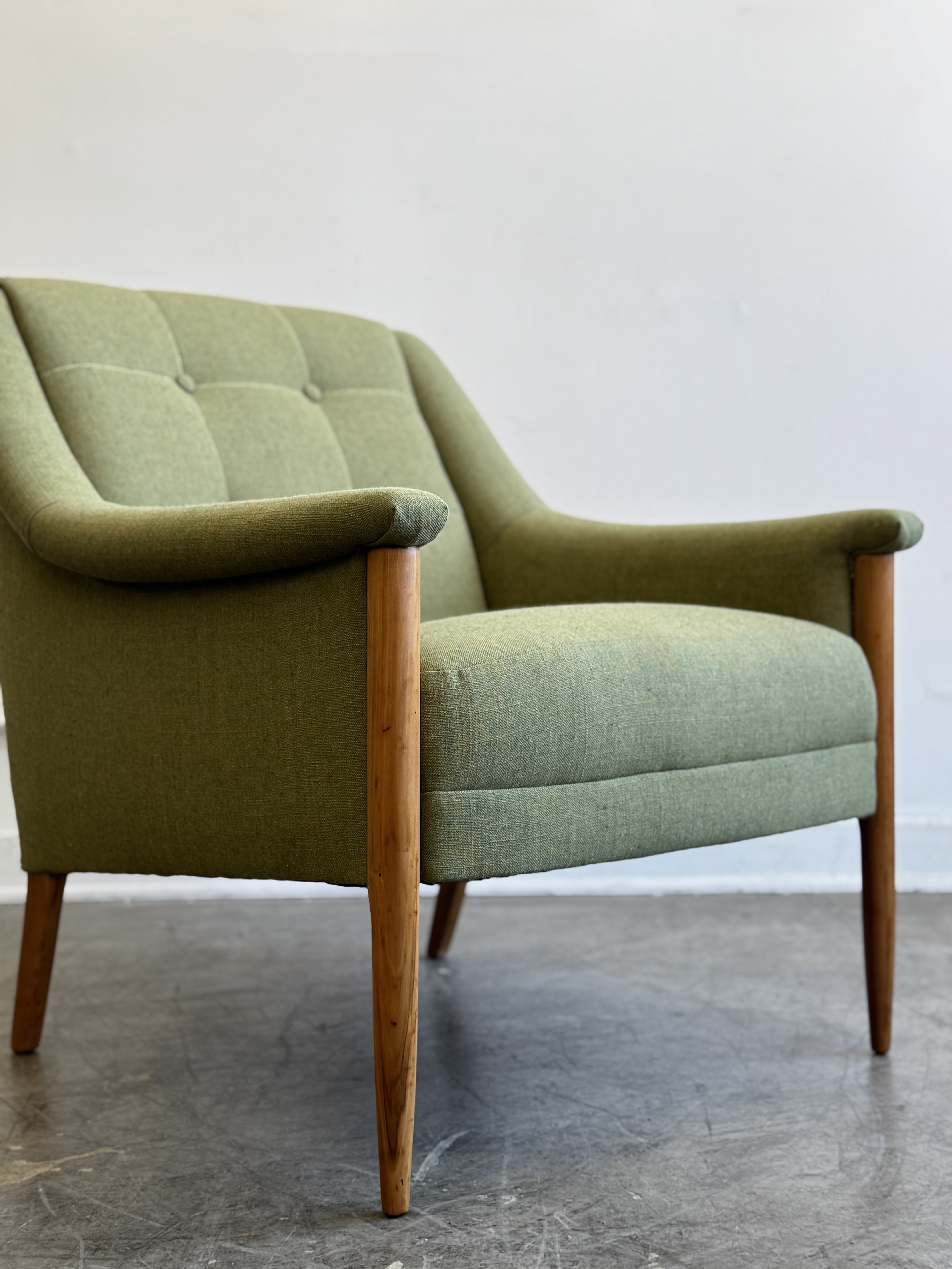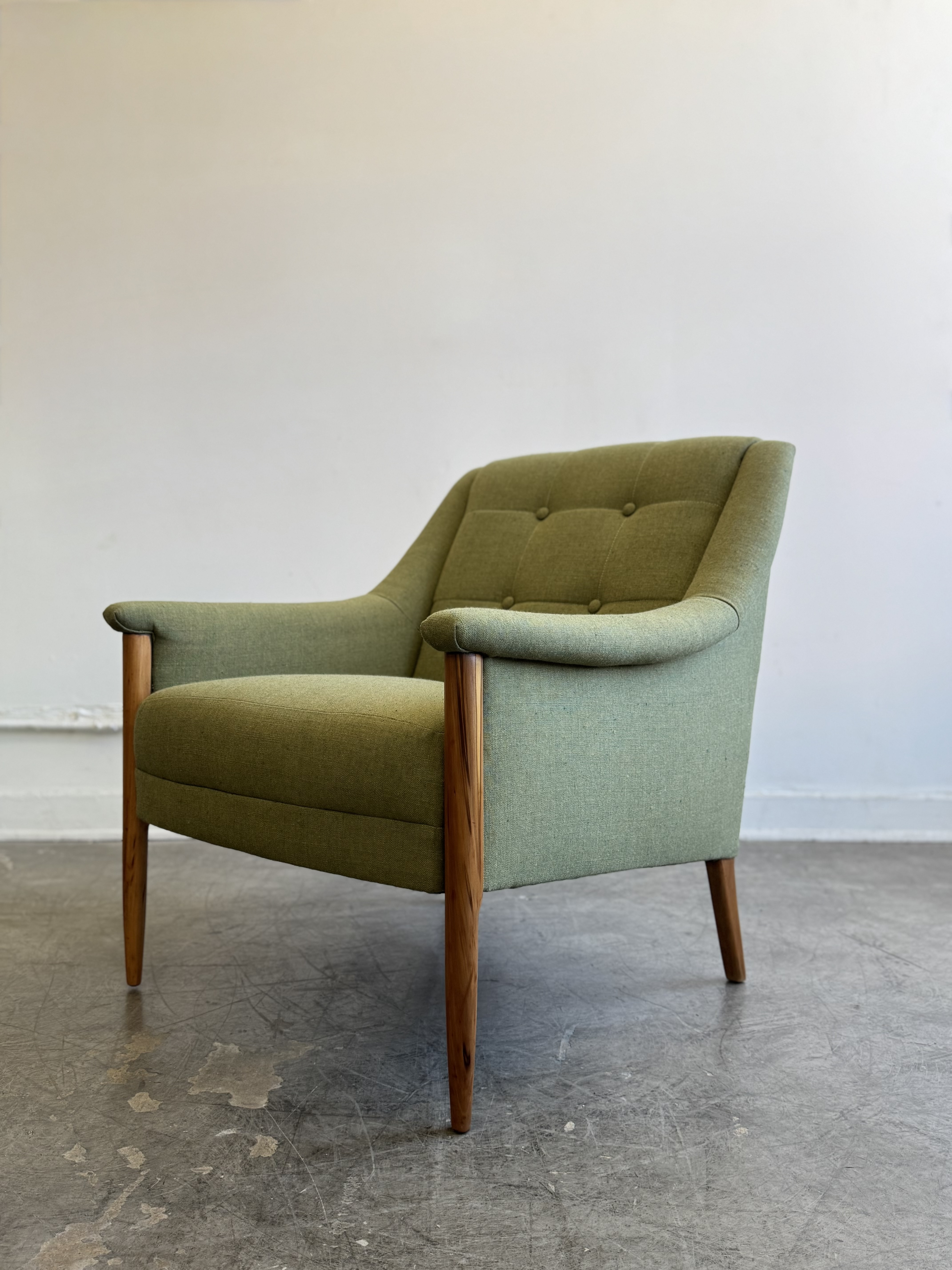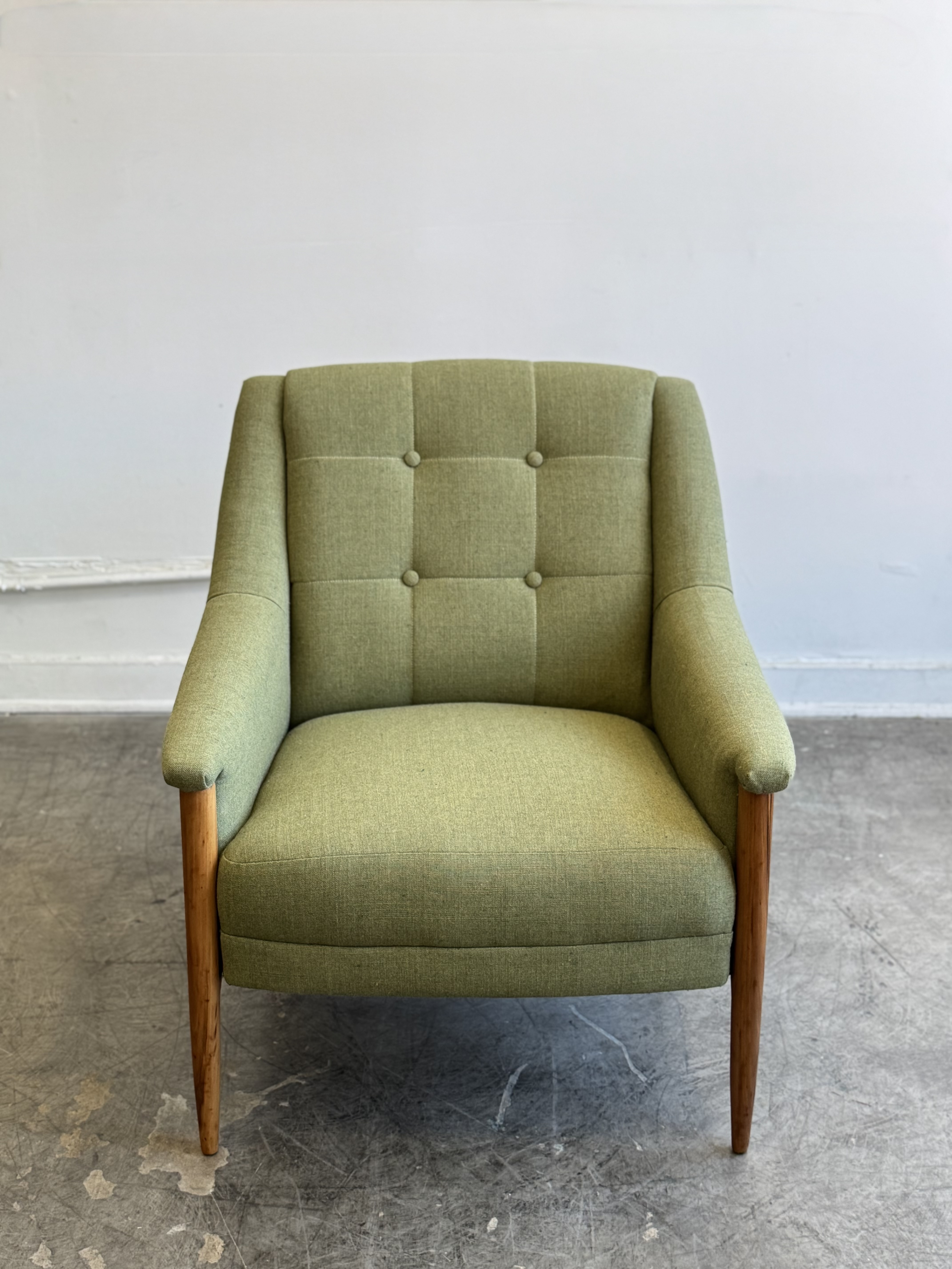 This stunning mid-century modern lounge chair by Khroeler is all about timeless elegance and comfort. Recently reupholstered in a soft sage green fabric, it features sculpted solid tapered legs that show off the natural beauty of the wood grain. The button-tufted back adds just the right touch of detail, while the low, angled profile makes it a perfect accent piece for any stylish interior. A true classic with fresh new life.