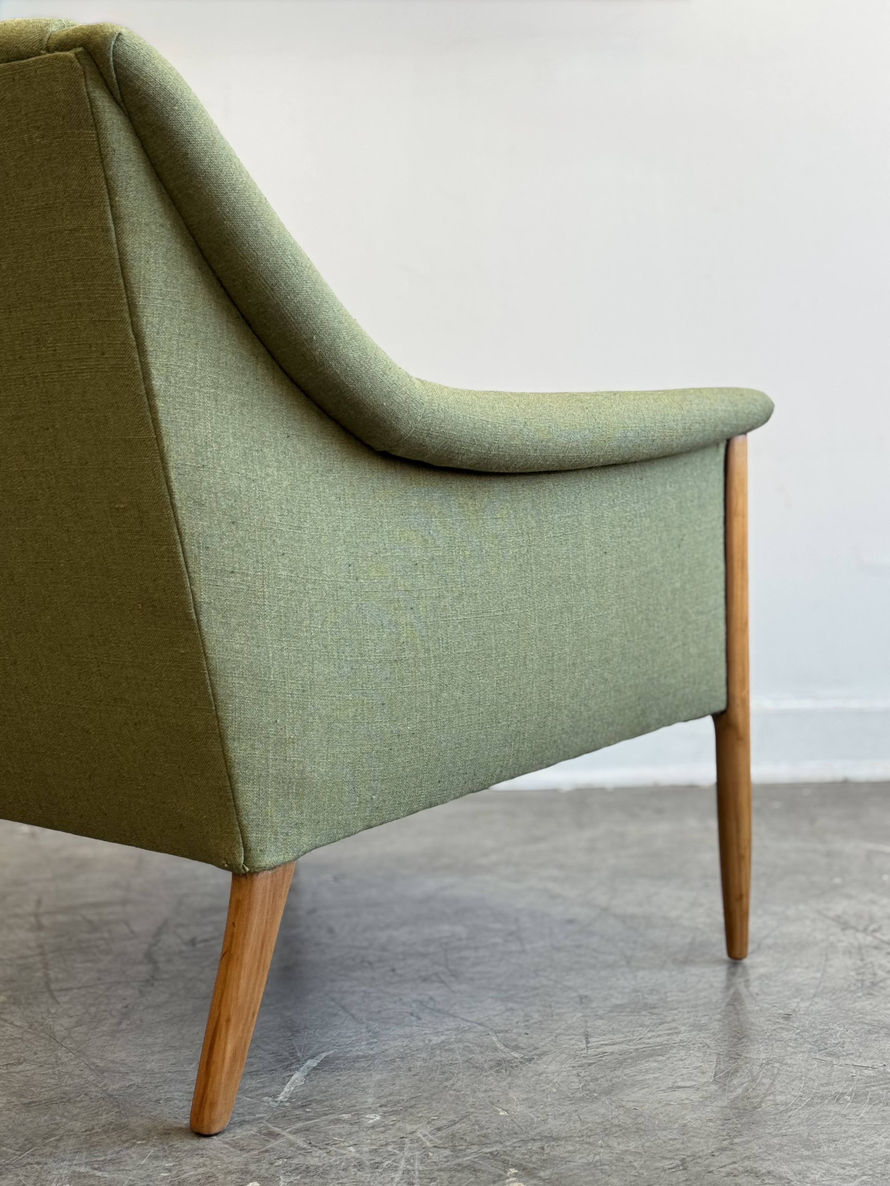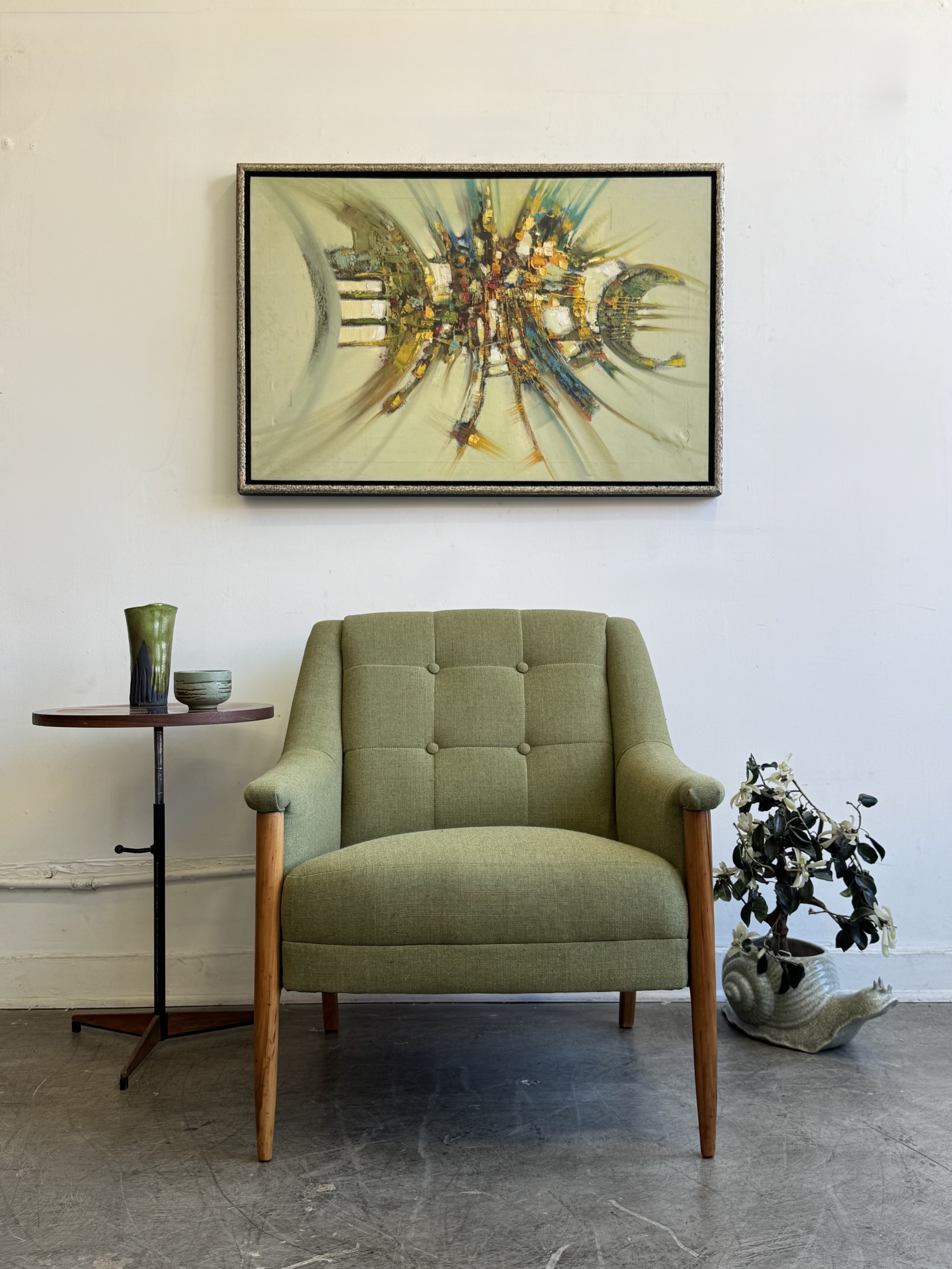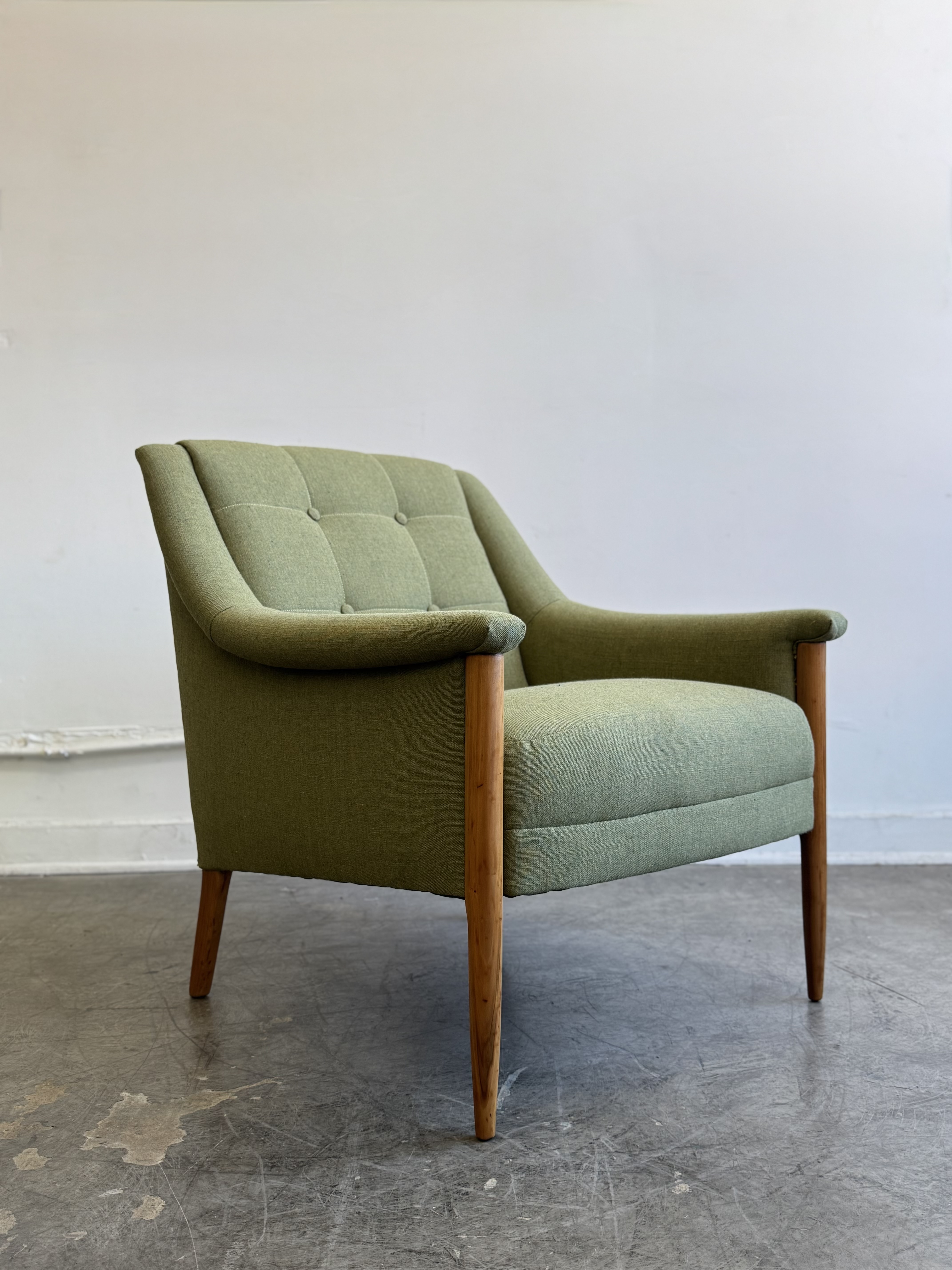 This stunning mid-century modern lounge chair by Khroeler is all about timeless elegance and comfort. Recently reupholstered in a soft sage green fabric, it features sculpted solid tapered legs that show off the natural beauty of the wood grain. The button-tufted back adds just the right touch of detail, while the low, angled profile makes it a perfect accent piece for any stylish interior. A true classic with fresh new life.