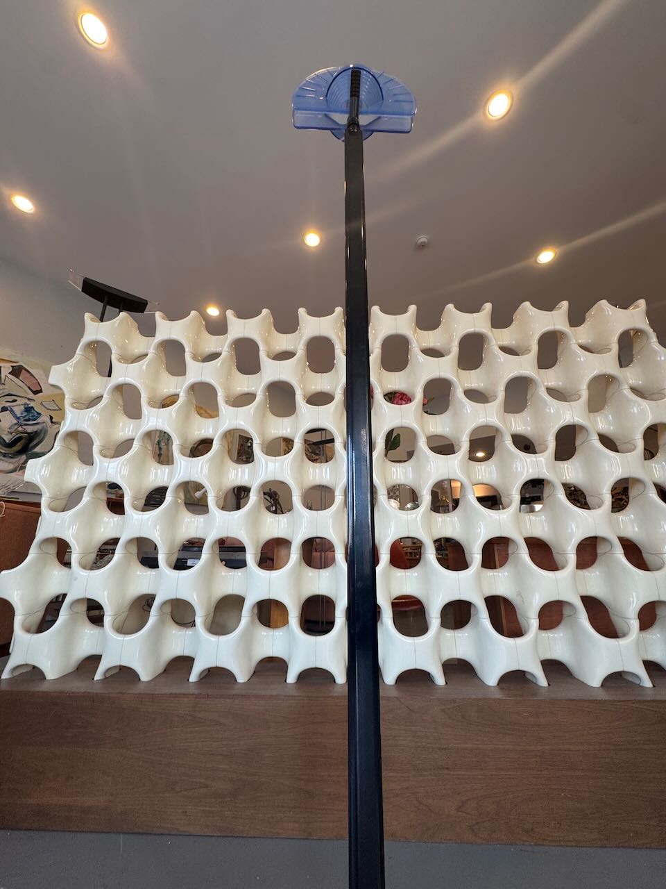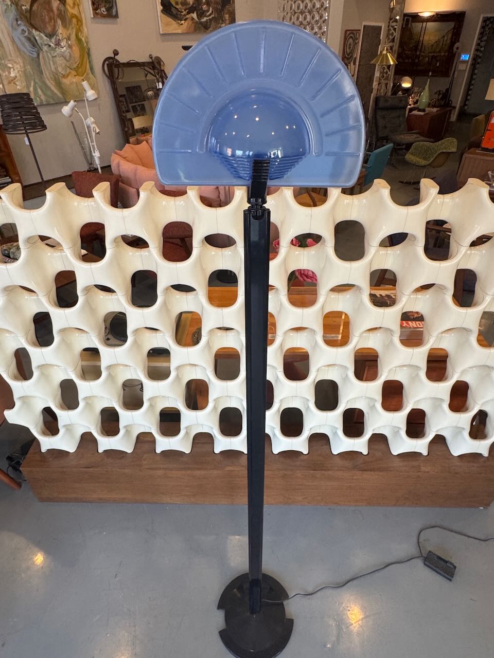 Italian Art Deco fan table lamp designed by Vincenzo Missanelli for the manufacturer Ladue Italia in the 1980s. It features a stunning, molded Murano glass shade atop a high-gloss black base. The design is noted for its sculptural appearance, elegant light, and vintage glamour.