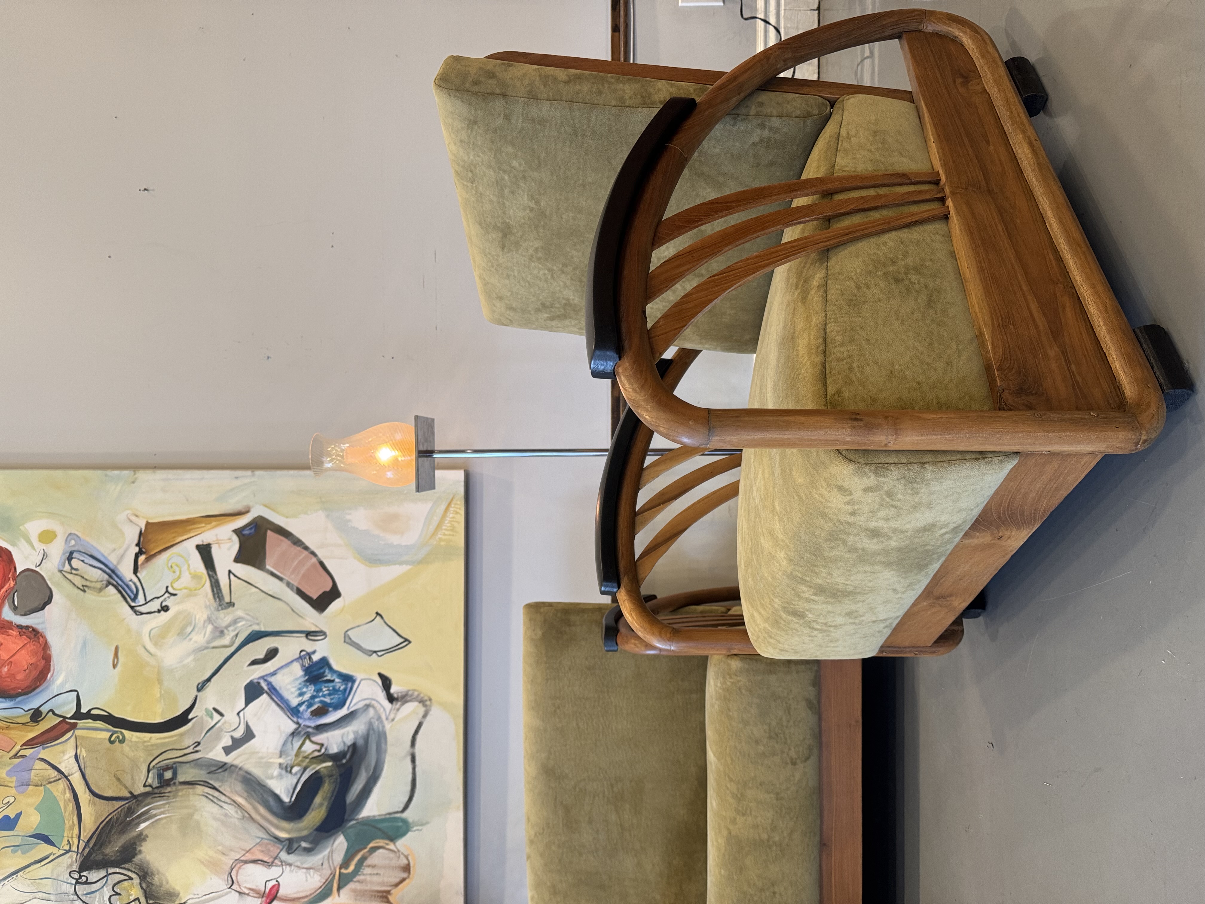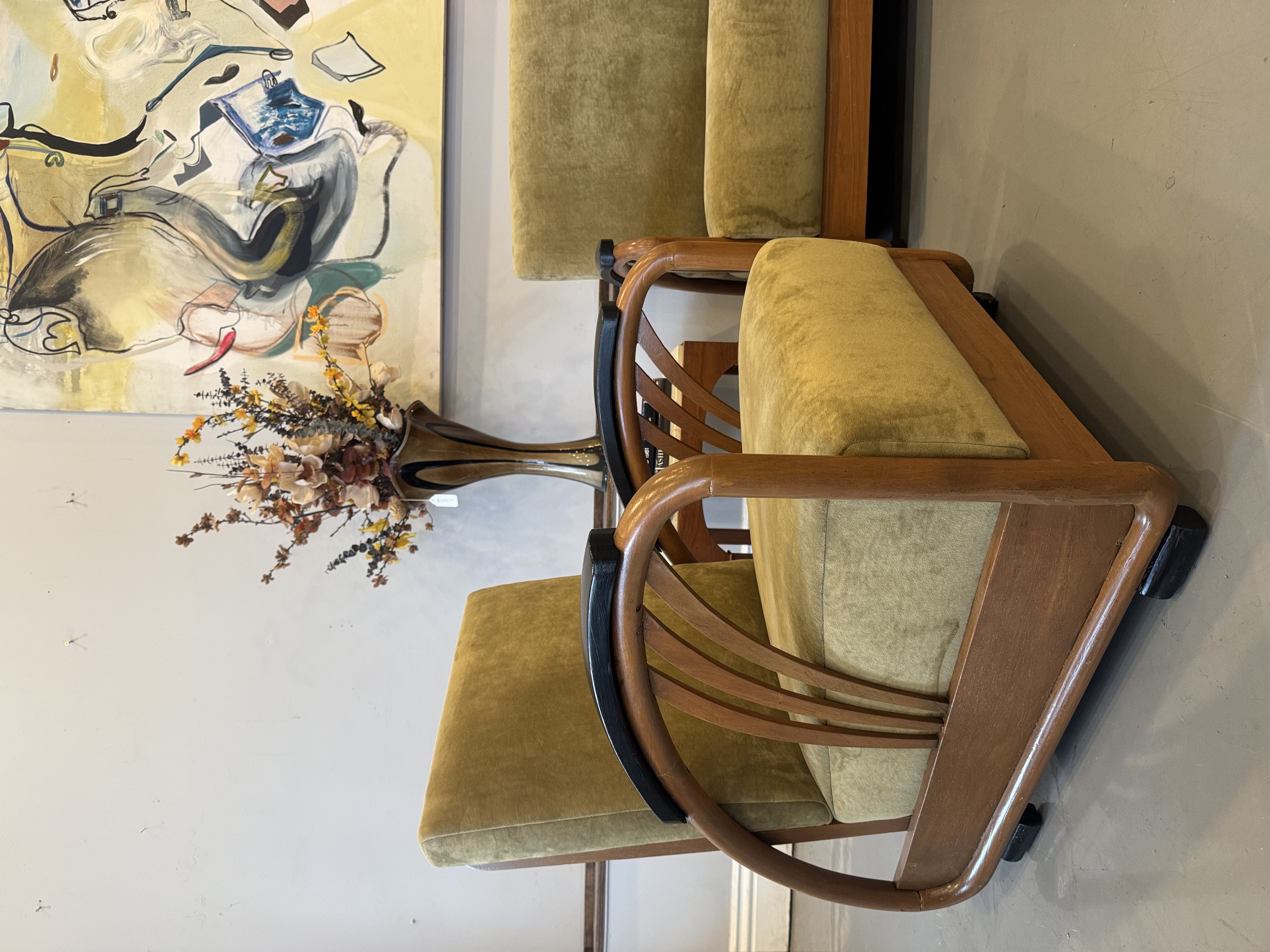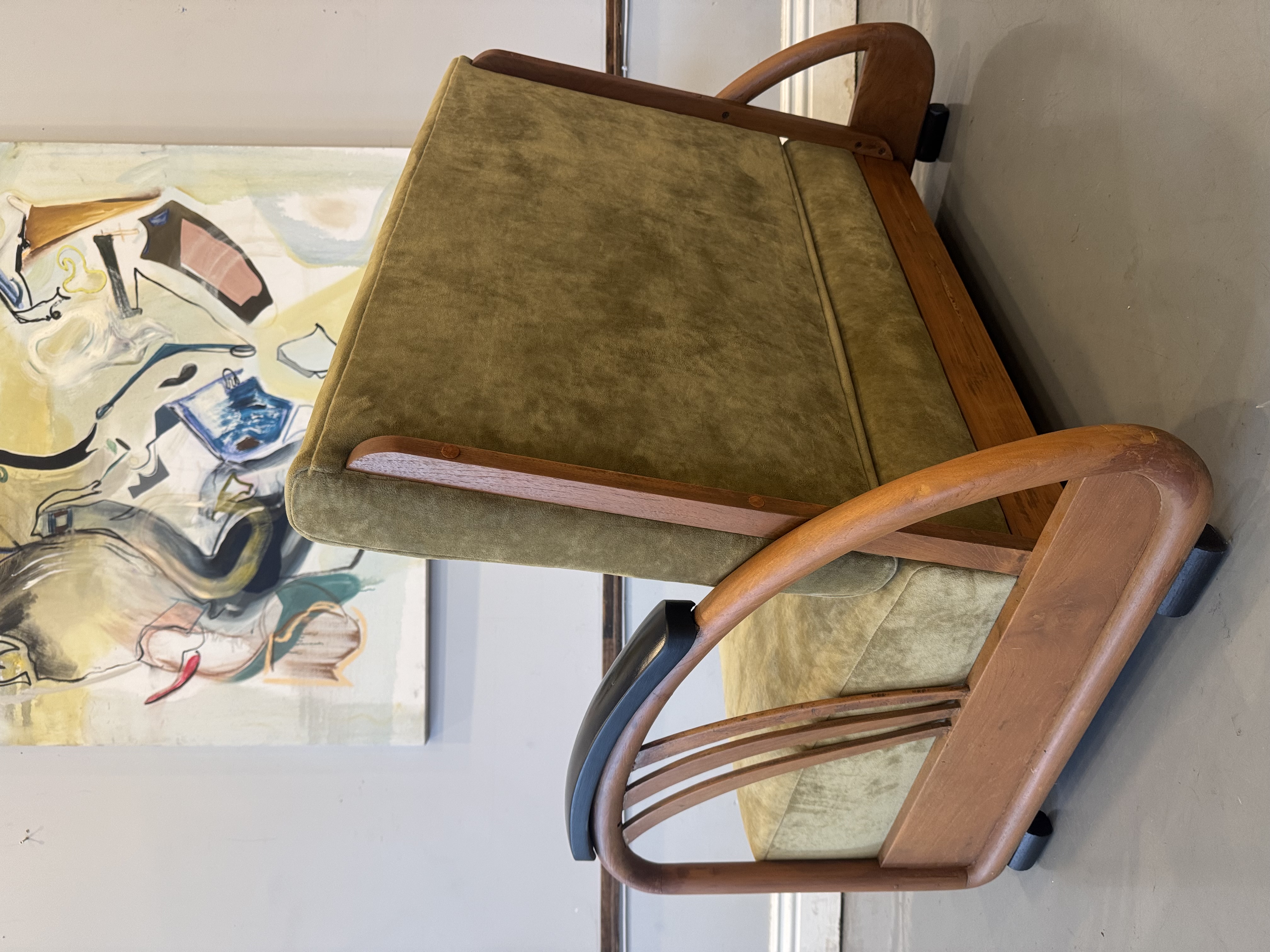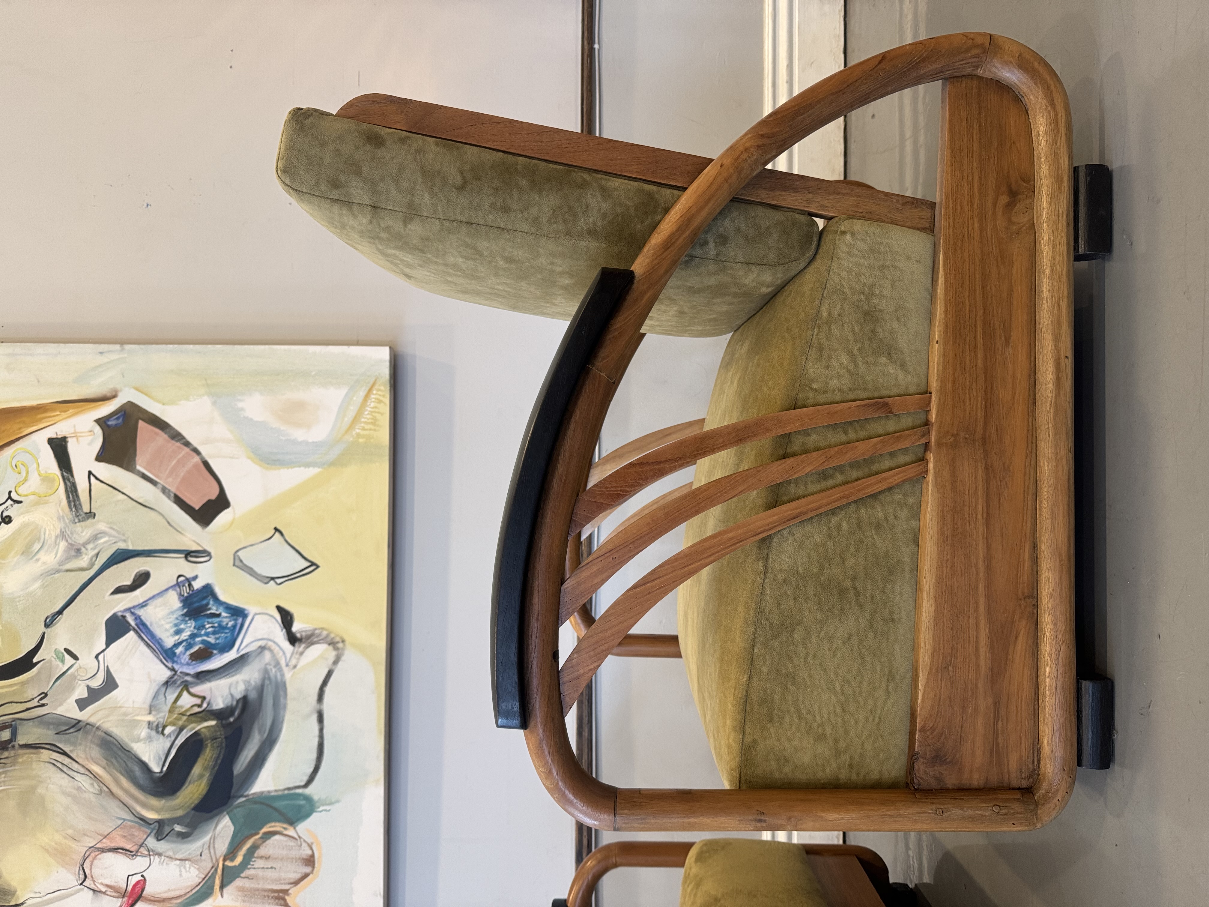 We have a stunning American Machine Age / Streamline Moderne lounge chairs & love seat circa 1935–1945. This stunning set captures the bold curves and low, sculptural profile that define the Art Deco era’s transition into modern design. Beautifully restored with fresh upholstery, these chairs highlight the streamlined, aerodynamic style inspired by the industrial optimism of the Machine Age. A rare and timeless set that brings authentic Art Deco character and statement presence to any space.