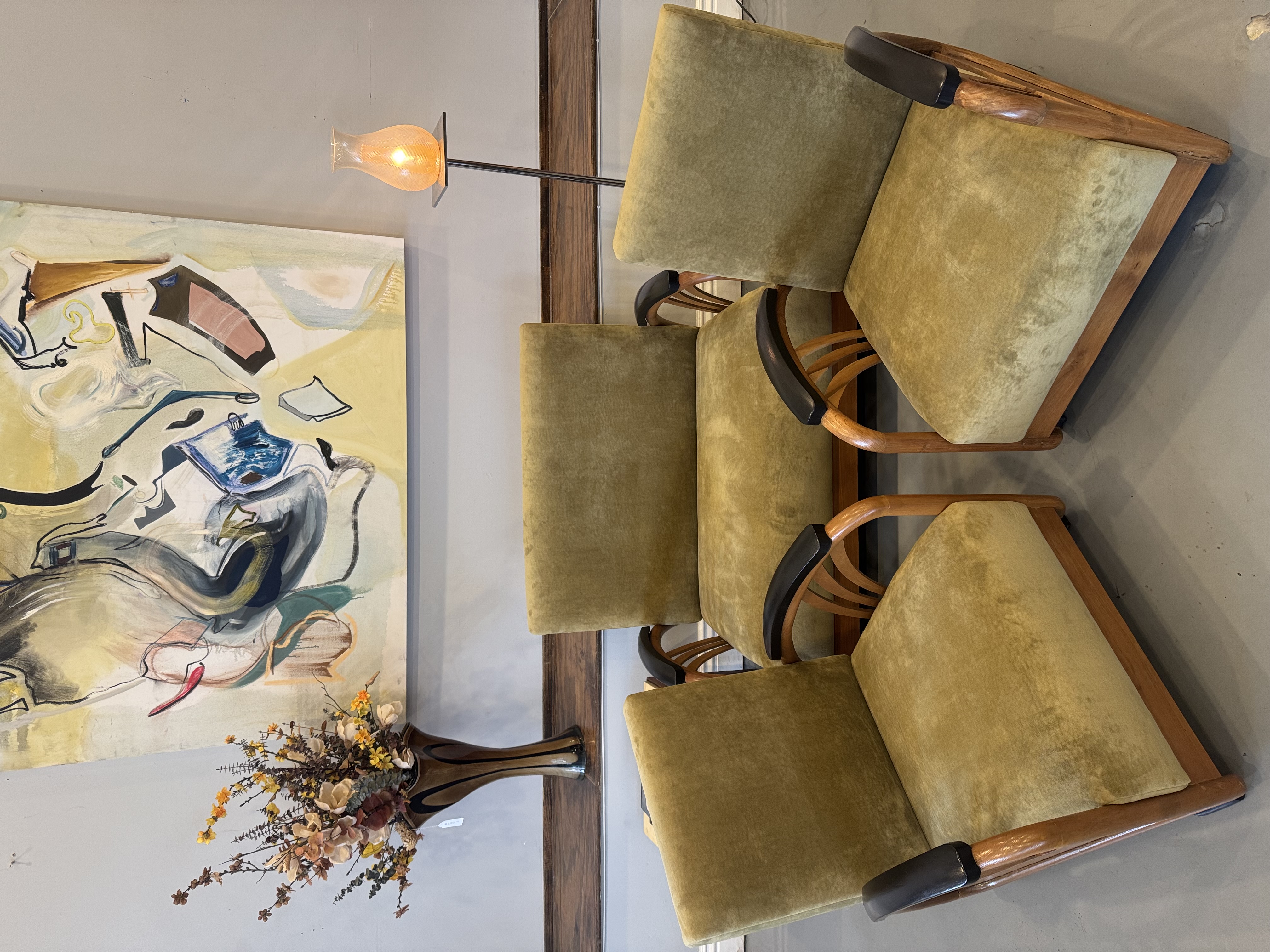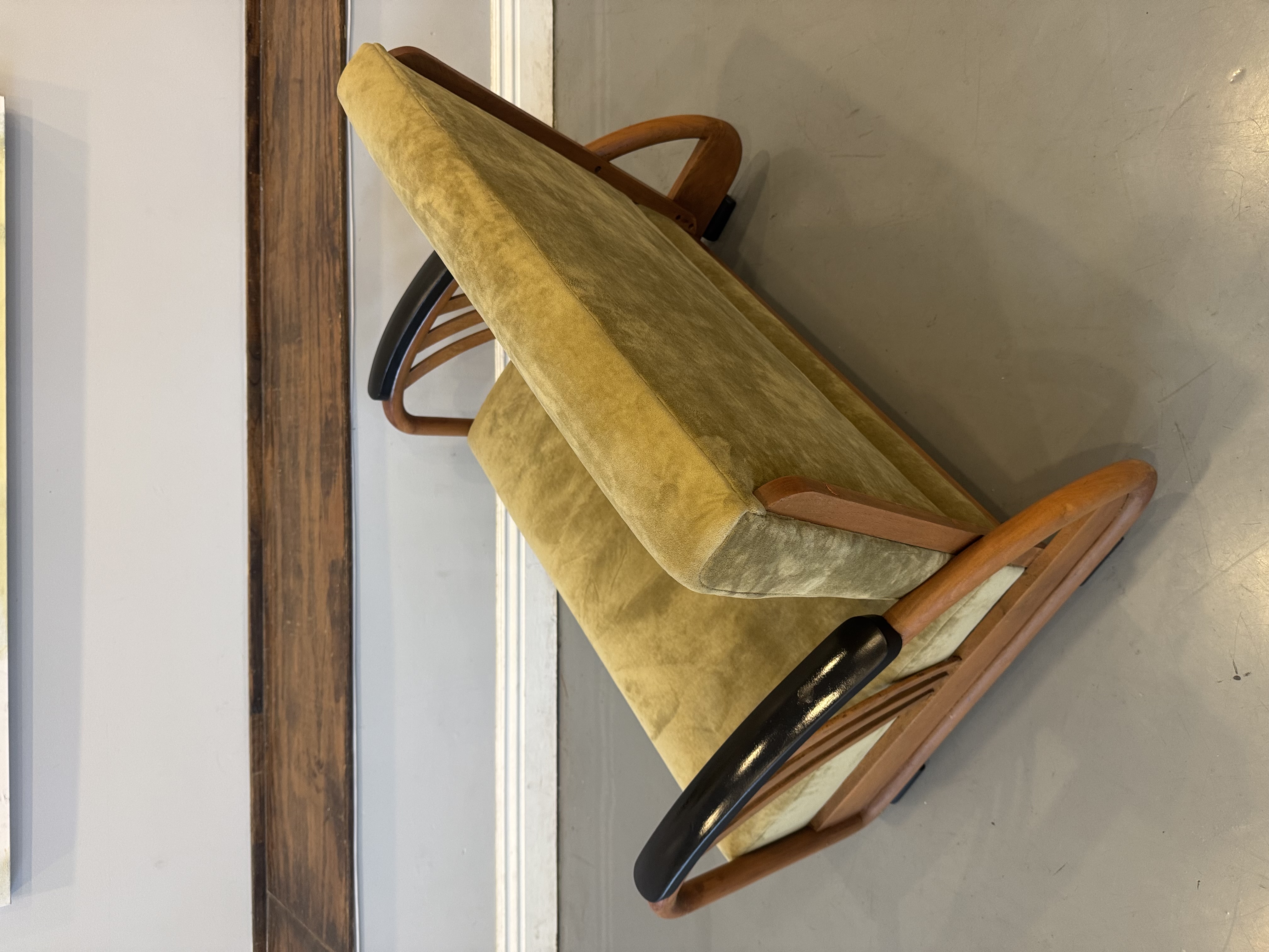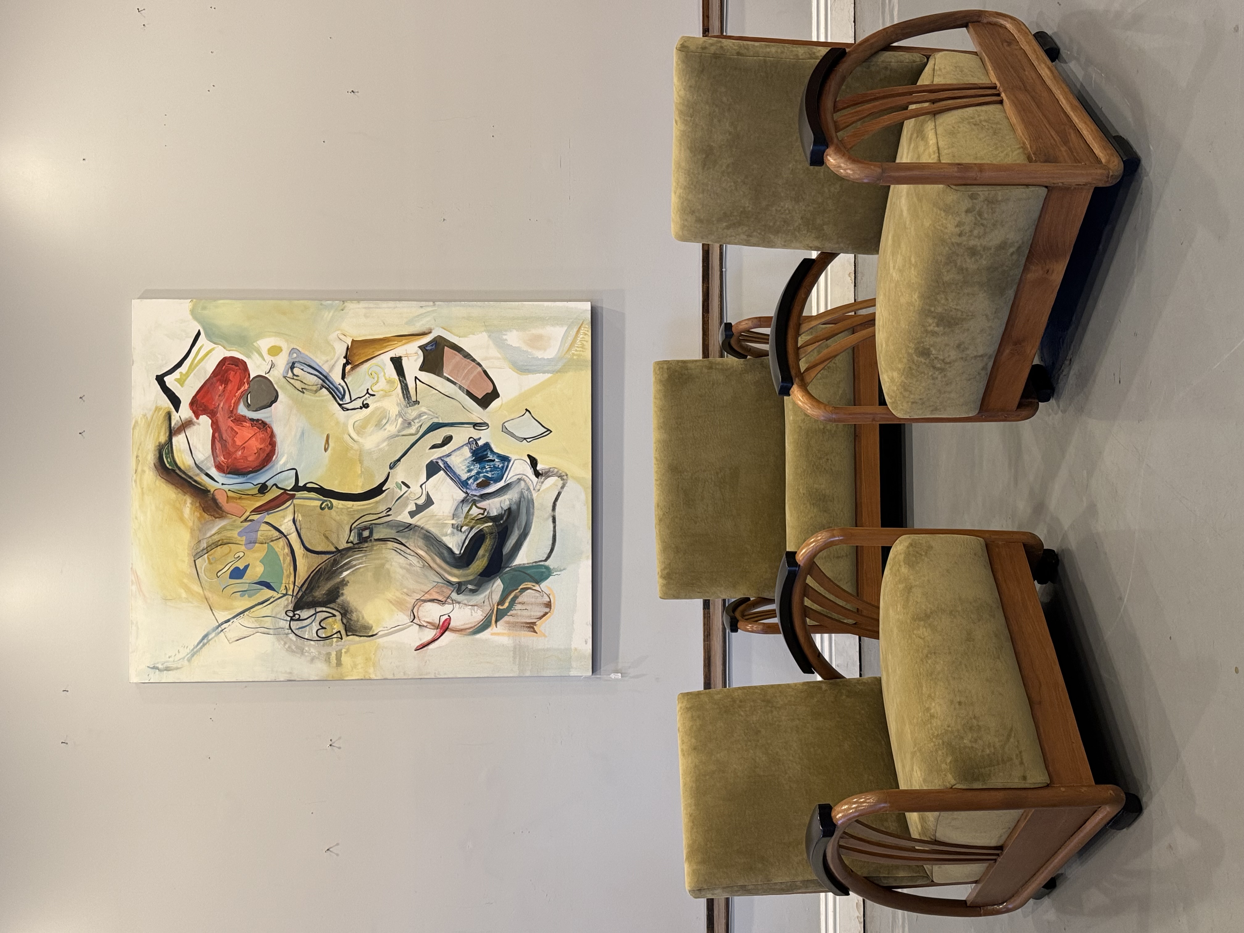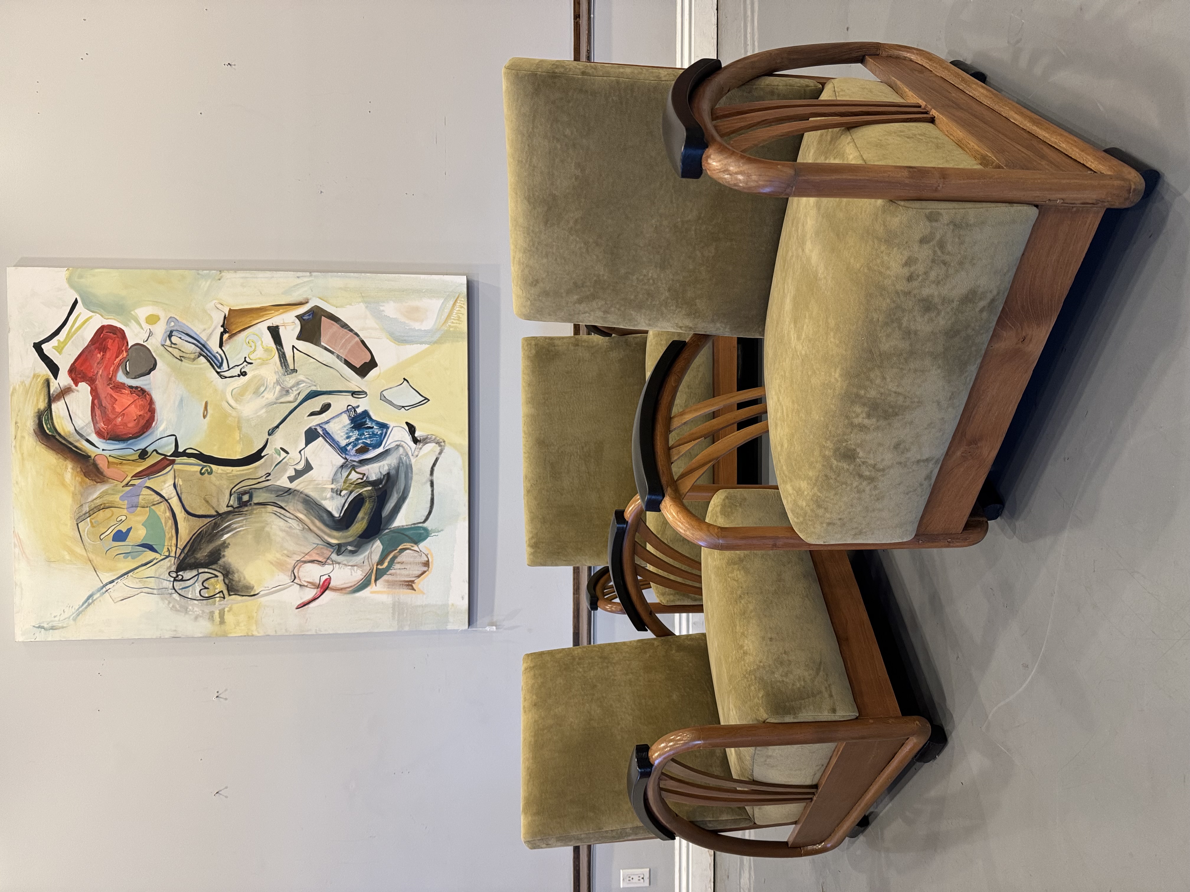 We have a stunning American Machine Age / Streamline Moderne lounge chairs & love seat circa 1935–1945. This stunning set captures the bold curves and low, sculptural profile that define the Art Deco era’s transition into modern design. Beautifully restored with fresh upholstery, these chairs highlight the streamlined, aerodynamic style inspired by the industrial optimism of the Machine Age. A rare and timeless set that brings authentic Art Deco character and statement presence to any space.