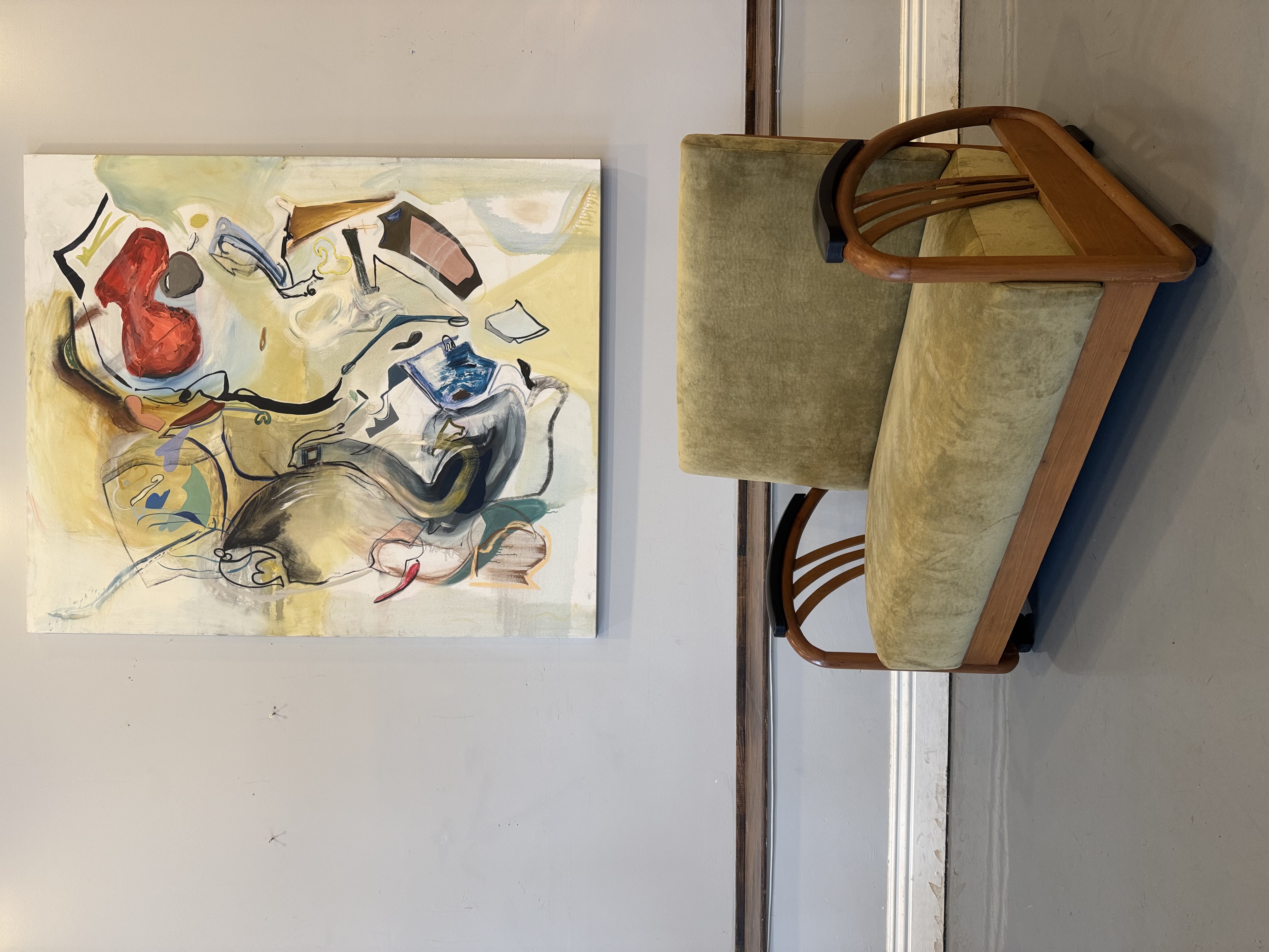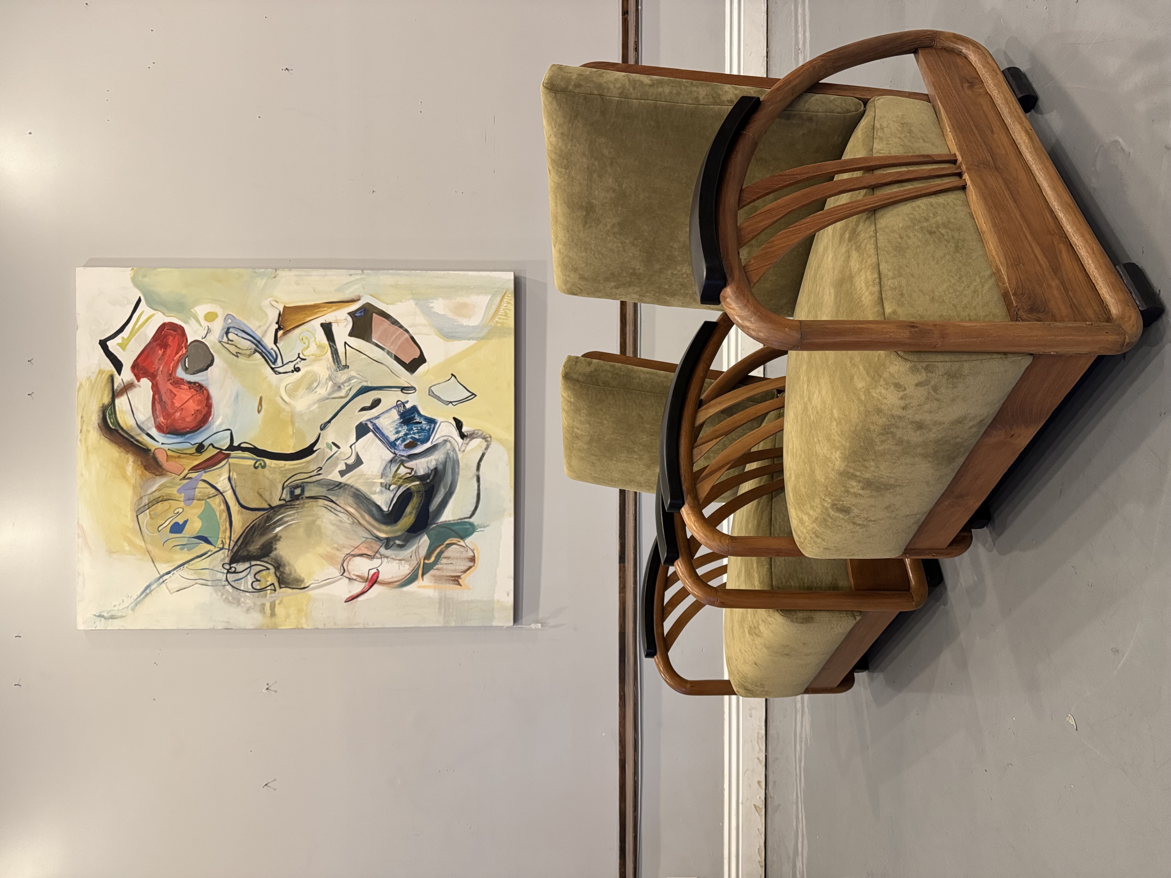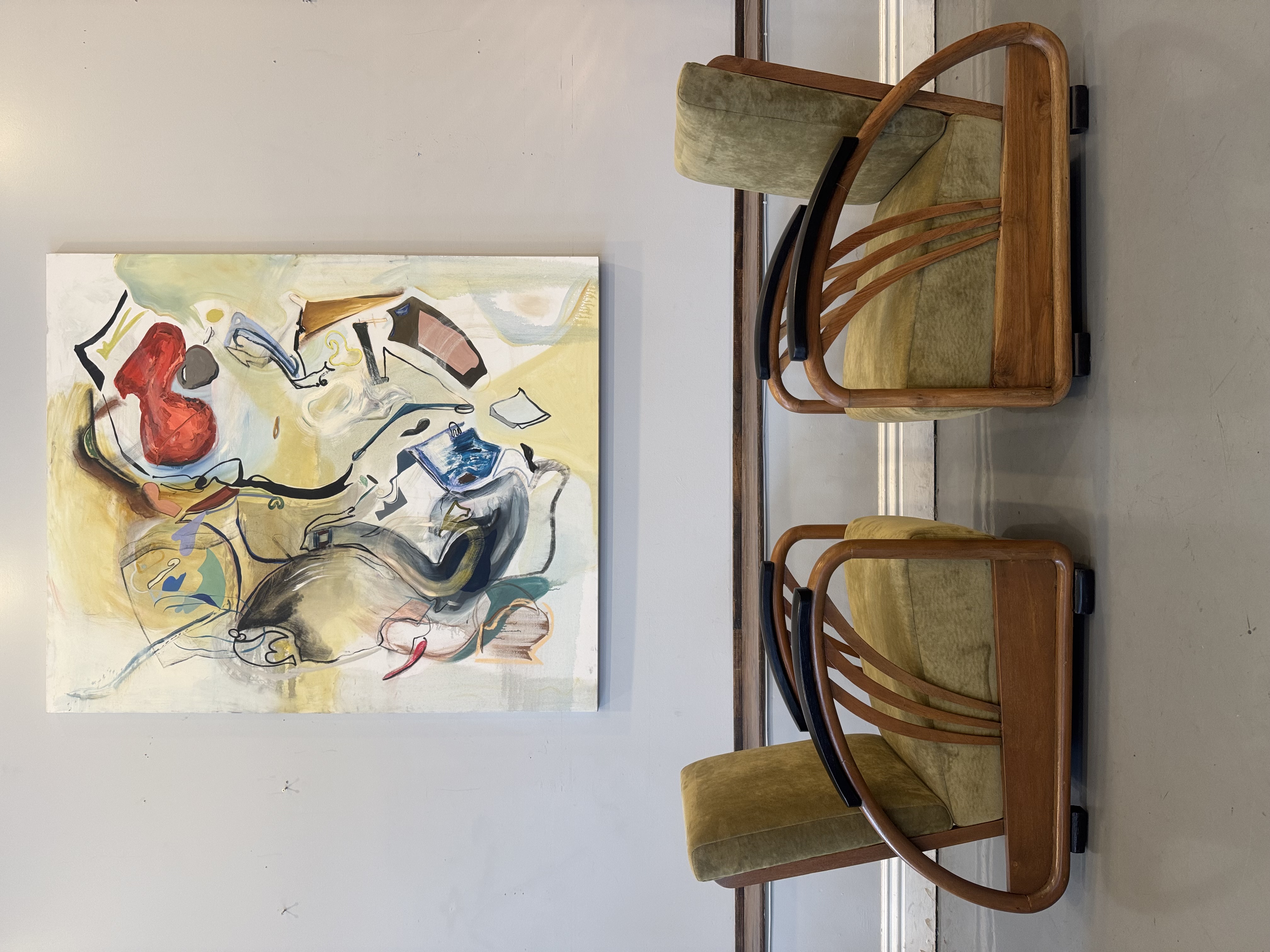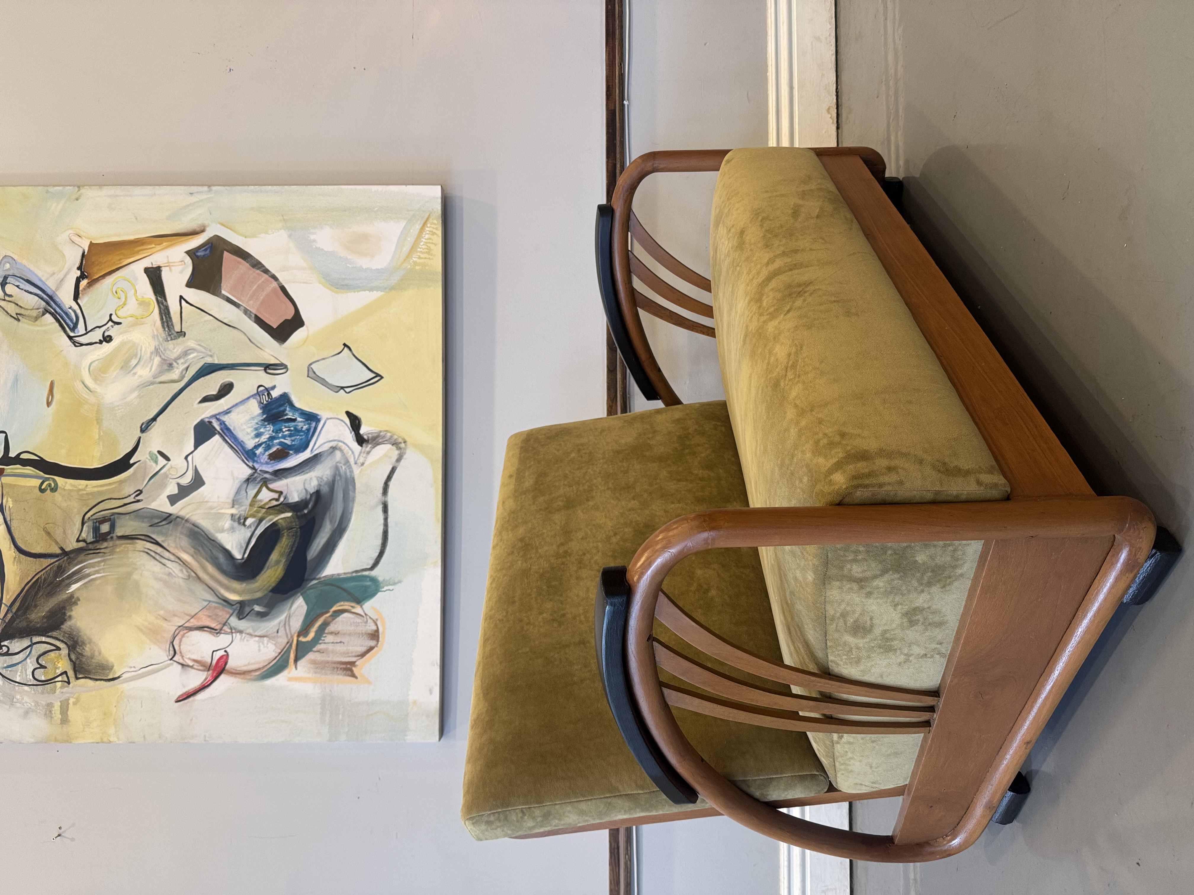 We have a stunning American Machine Age / Streamline Moderne lounge chairs & love seat circa 1935–1945. This stunning set captures the bold curves and low, sculptural profile that define the Art Deco era’s transition into modern design. Beautifully restored with fresh upholstery, these chairs highlight the streamlined, aerodynamic style inspired by the industrial optimism of the Machine Age. A rare and timeless set that brings authentic Art Deco character and statement presence to any space.