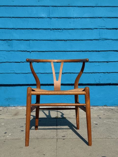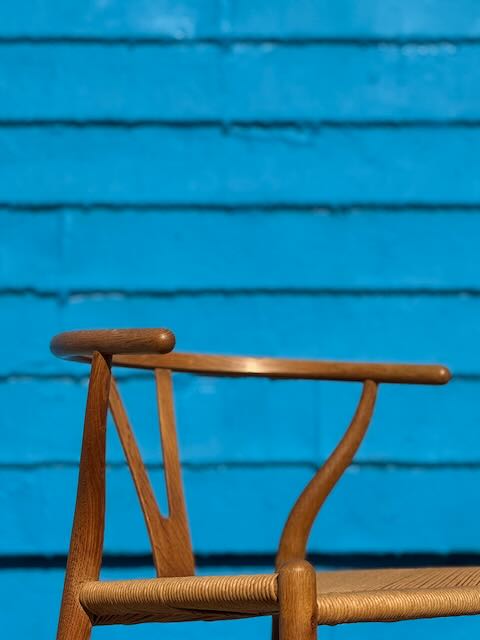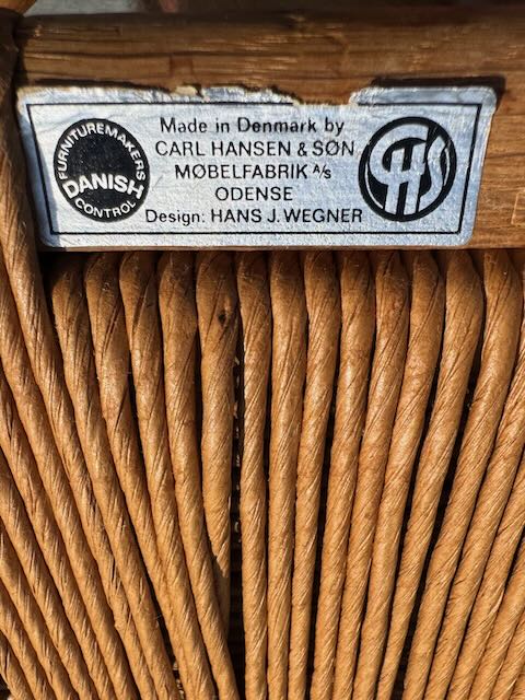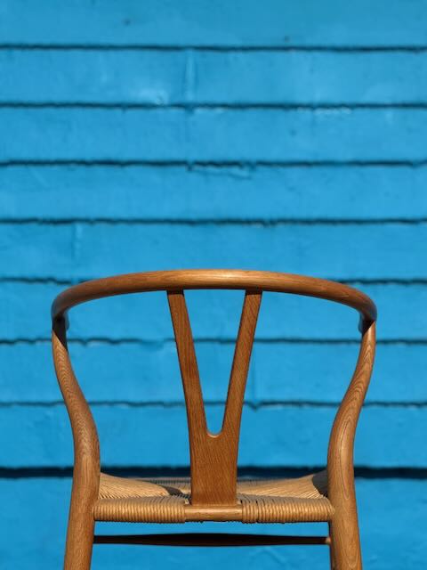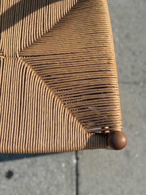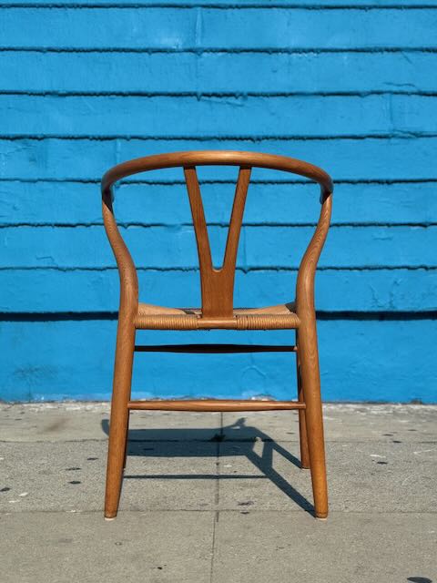 Wishbone” chair here by the famous Danish designer Hans Wegner designed in 1949 for Carl Hansen & Søn. Known as the CH24 chair or Y chair, it is recognizable by its Y-shaped backrest and bentwood armrests. The frame is made of solid oak, the seat is made of original woven paper rope. Excellent vintage condition with a beautiful patina, this chair is perfect for any space.