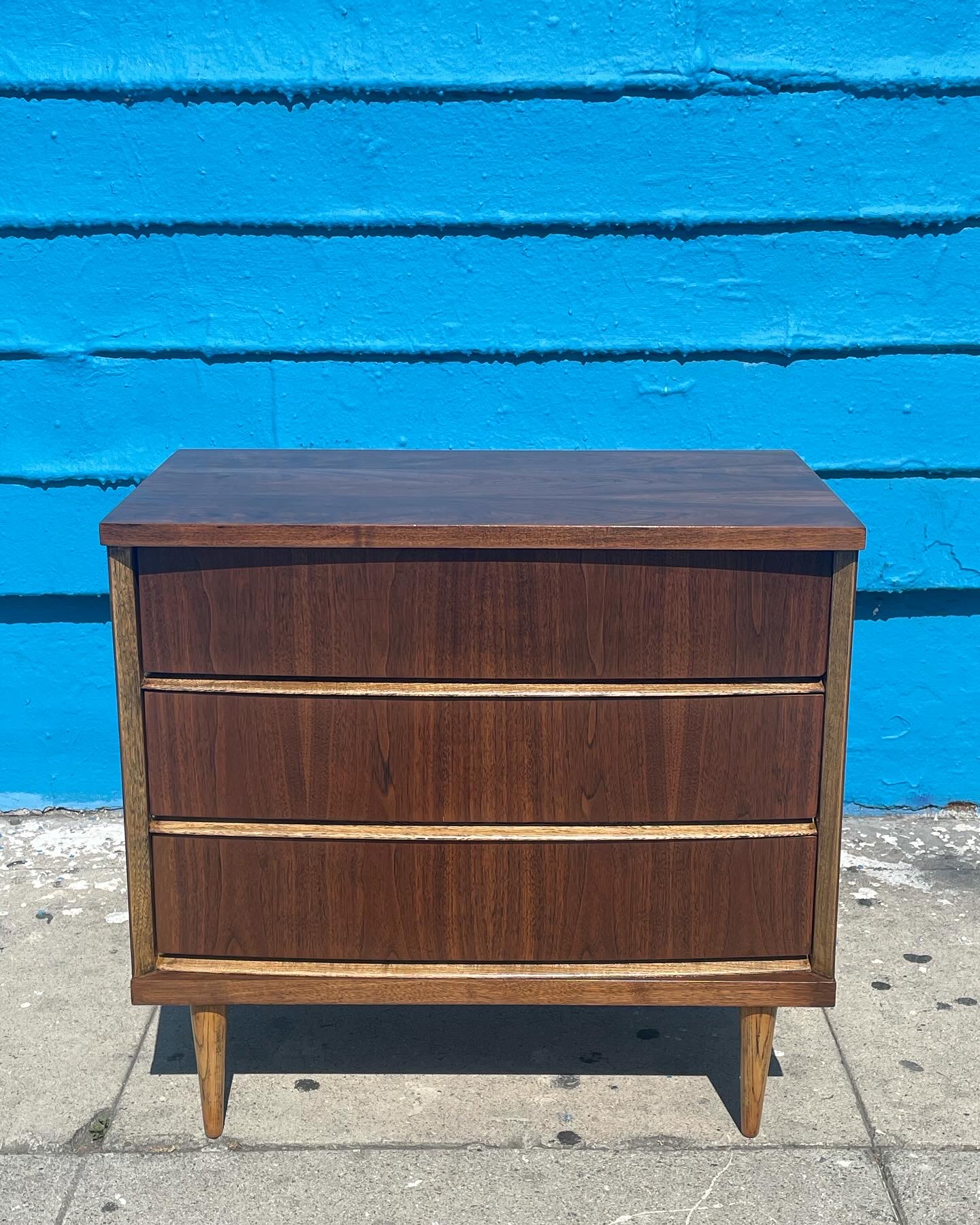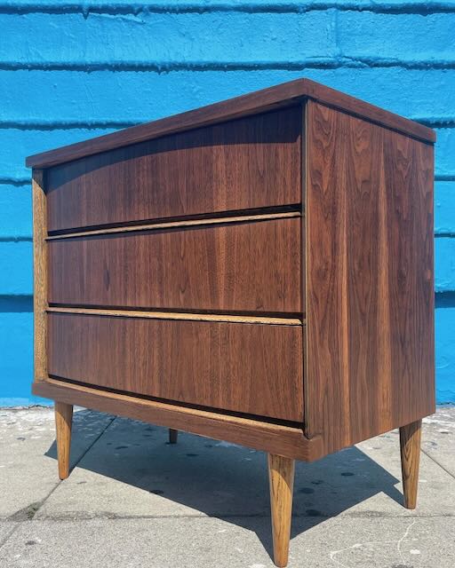 Beautifully Restored mid‑century Bassett Furniture dresser in walnut + oak—sleek 3‑drawer design with tapered legs, beautifully refinished to highlight the wood’s natural grain. Perfect for modern and vintage-inspired spaces.