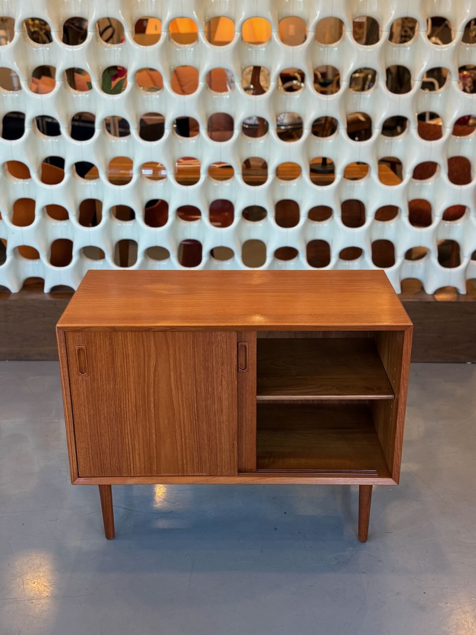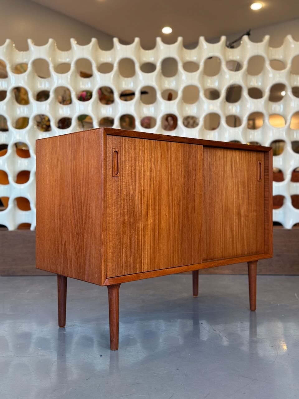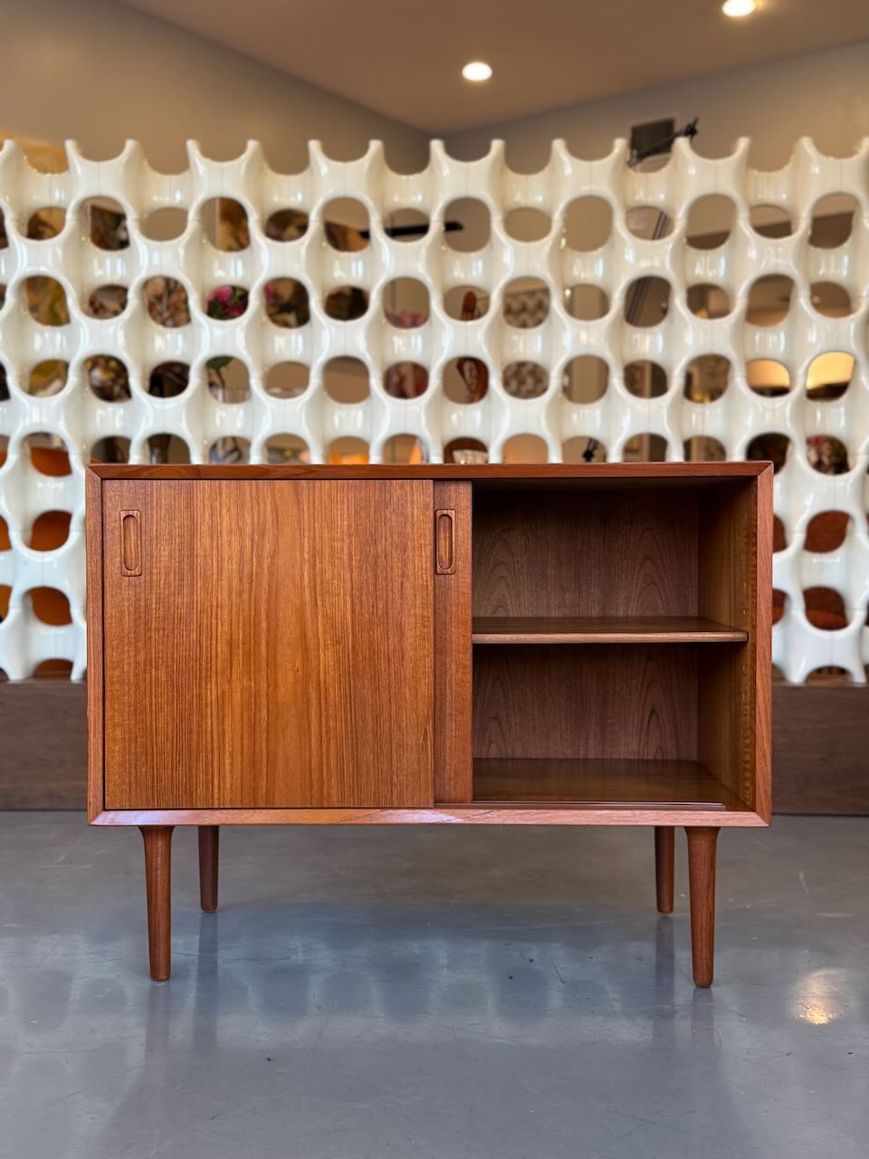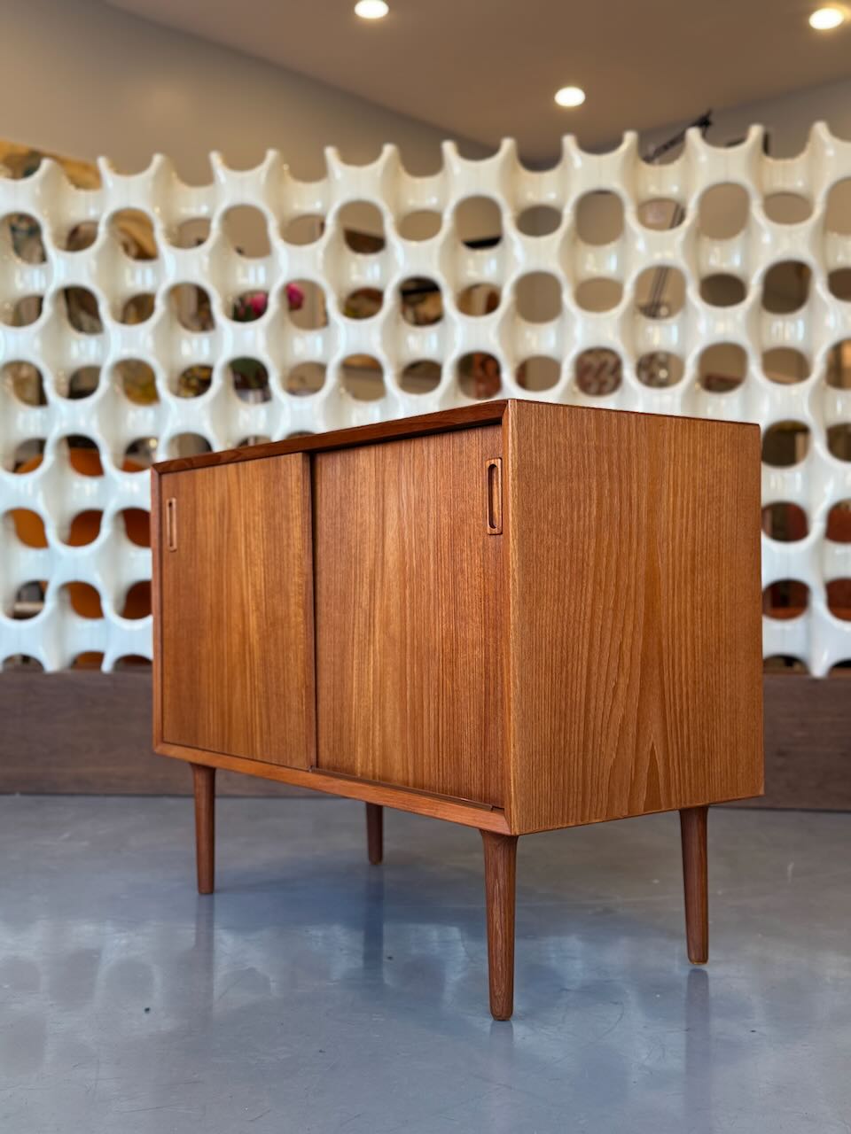 We are excited to offer this beautiful 1960s Danish Modern Teak Cabinet by Lyby Mobler. This authentic, high-quality piece of Mid-Century Modern furniture features a rich teak wood finish, sleek lines, smooth sliding doors, and adjustable interior shelving. It’s in excellent vintage condition and ready for a stylish new home.
