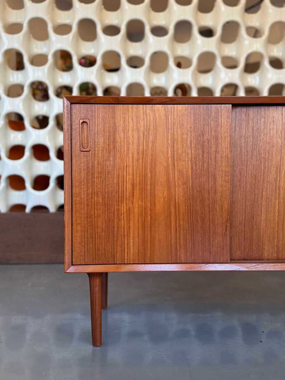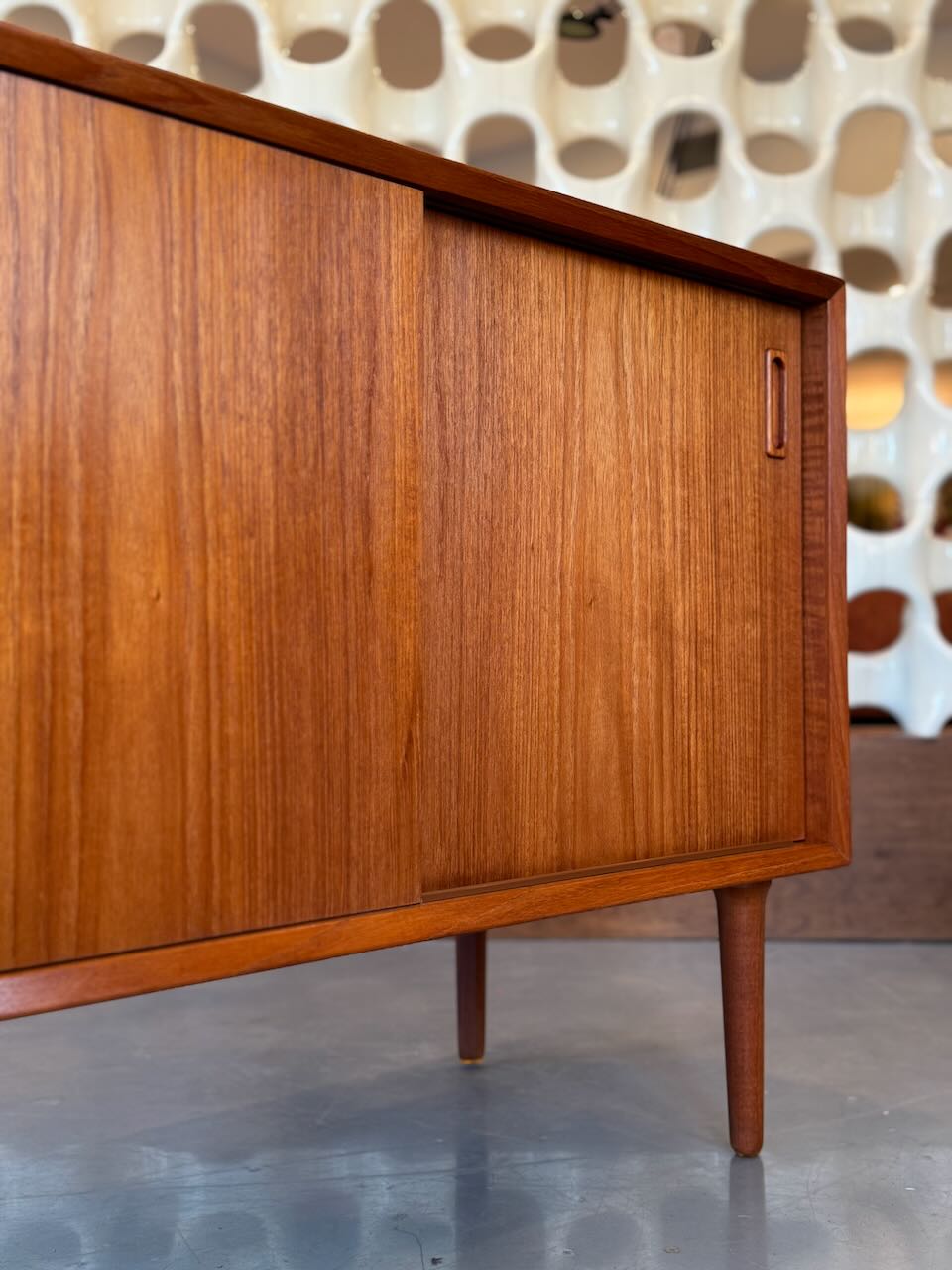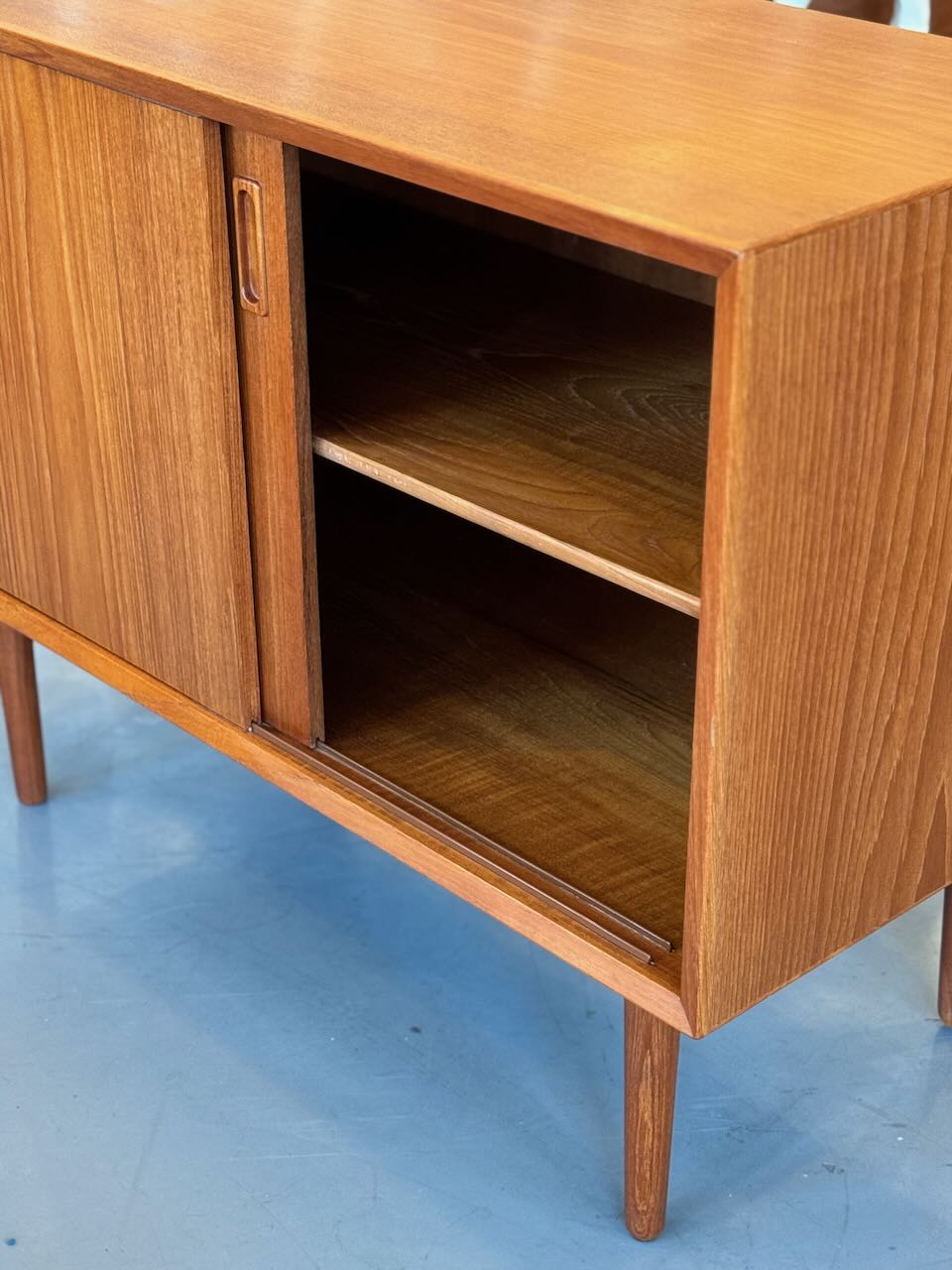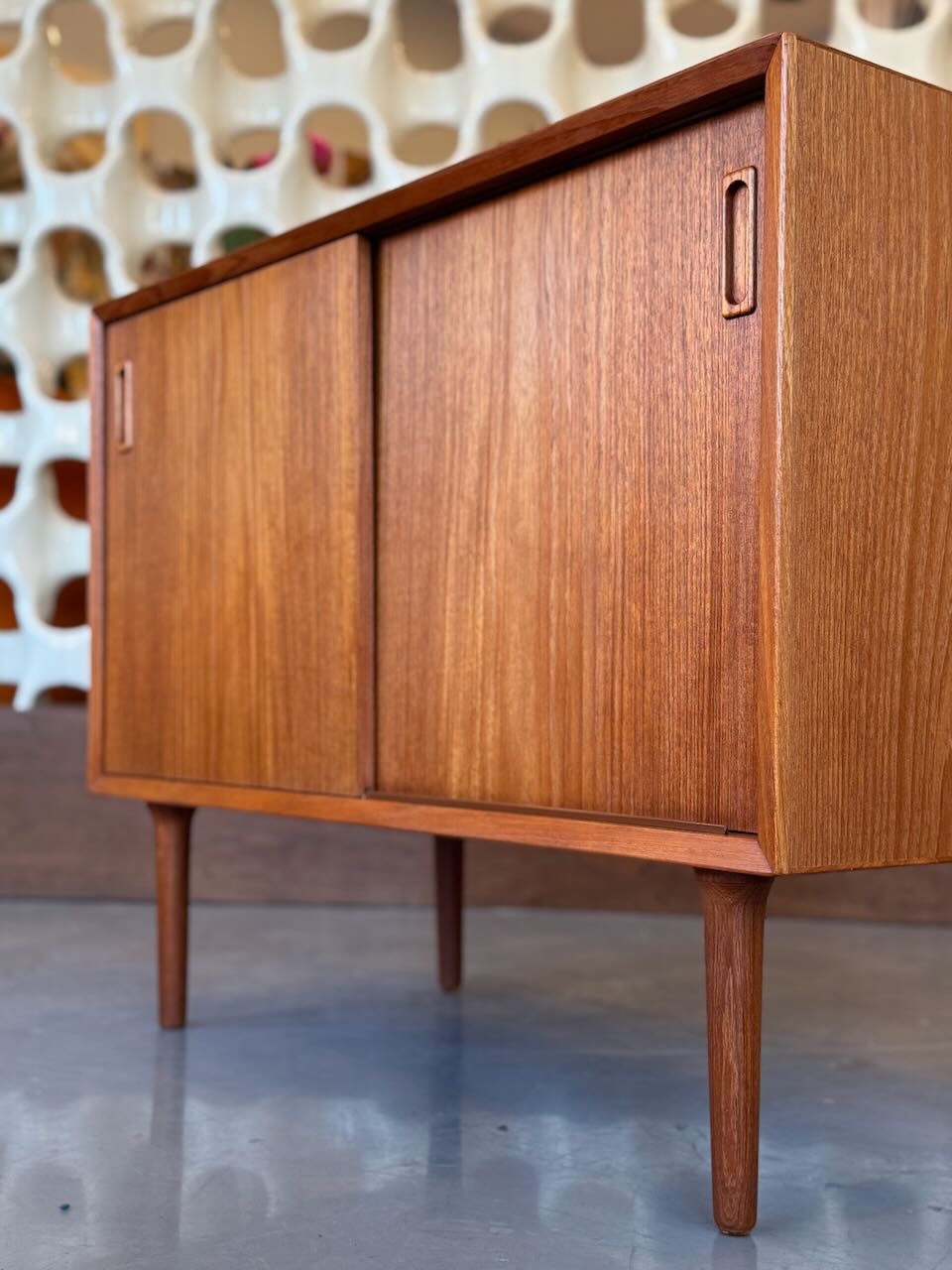 We are excited to offer this beautiful 1960s Danish Modern Teak Cabinet by Lyby Mobler. This authentic, high-quality piece of Mid-Century Modern furniture features a rich teak wood finish, sleek lines, smooth sliding doors, and adjustable interior shelving. It’s in excellent vintage condition and ready for a stylish new home.