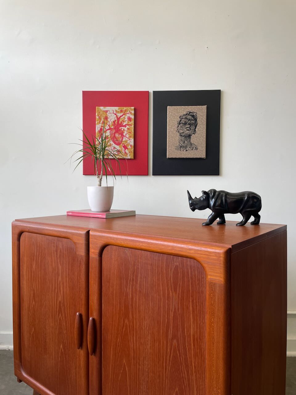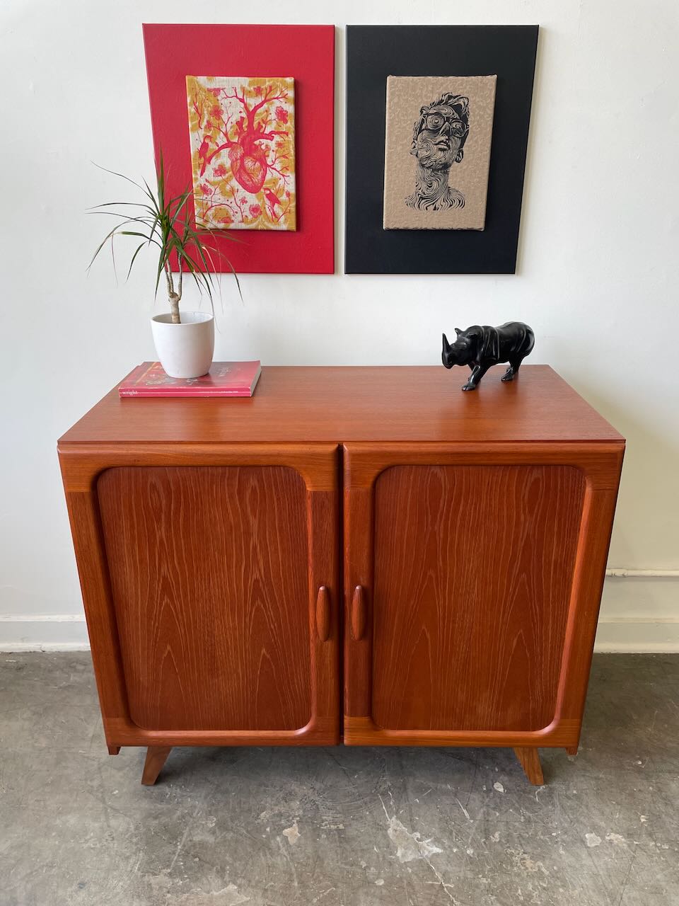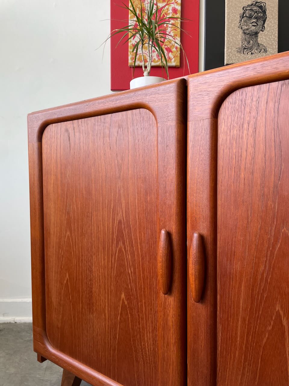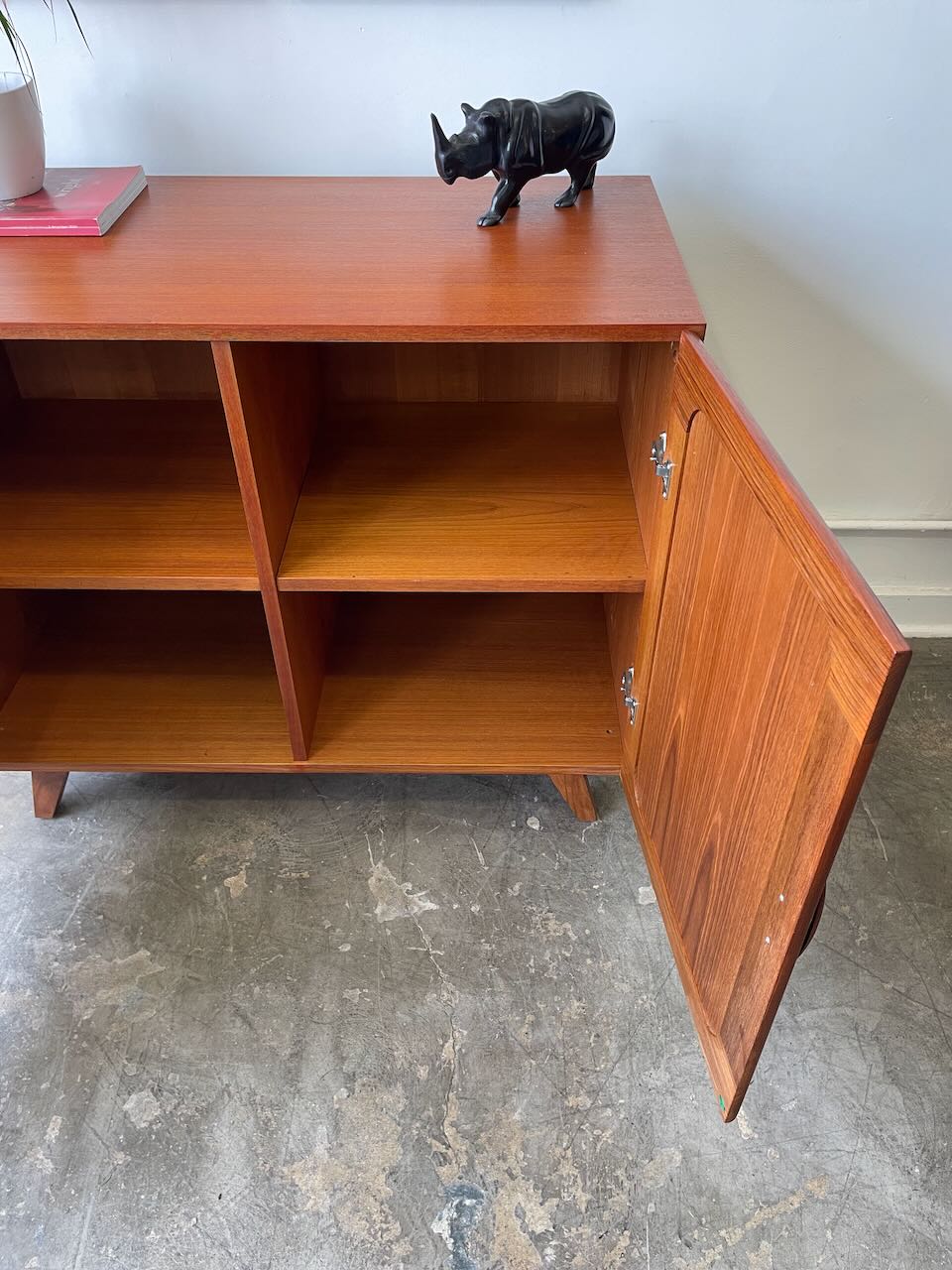 Danish modern cabinet by Dyrlund featuring a sculptural front with original carved pulls and beautiful teak grain throughout. Modified with angled legs for a lighter, elevated look. Clean interior with open storage and center shelving simple, functional, and ready for everyday use.