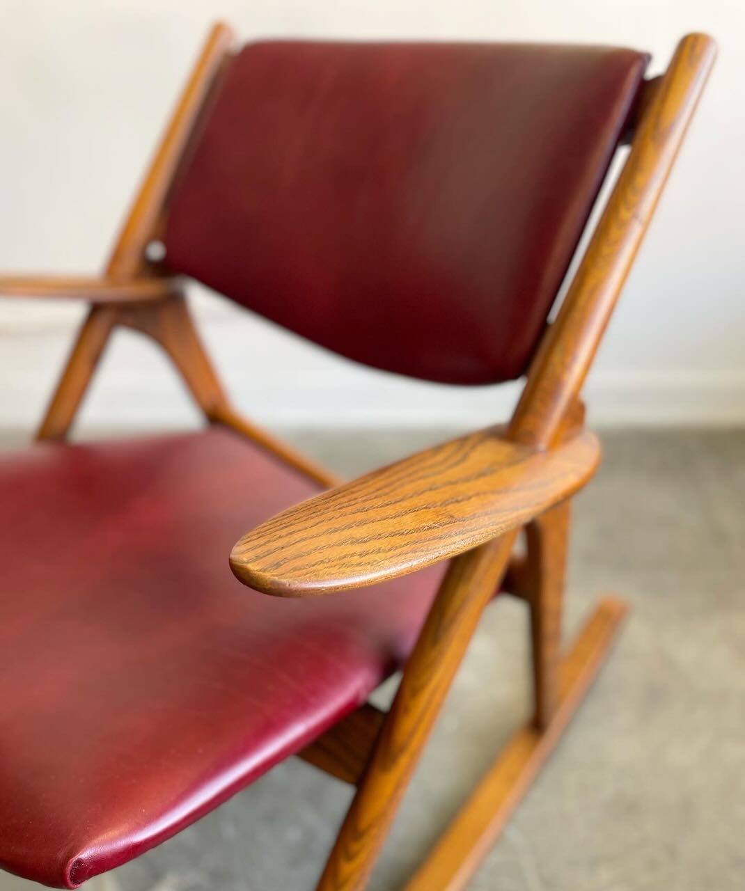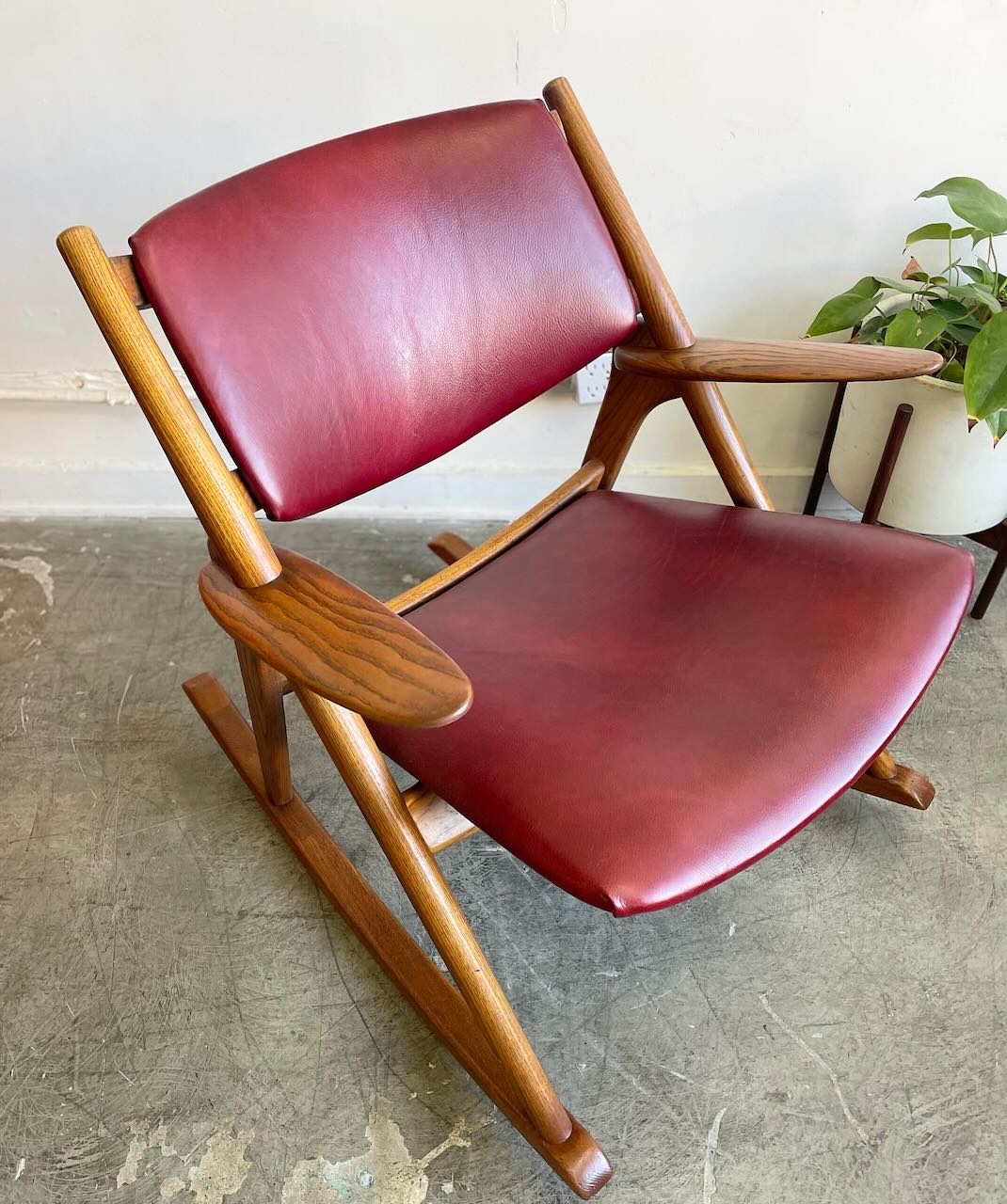 🎁Extremely excited about this beautiful rocker — inspired by that iconic Hans Wegner / Carl Hansen Sawhorse–style design. The sculptural oak frame is stunning from every angle, with crazy grain patterns and those clean, angular lines that make this style so special. It’s been newly re-covered in a soft, deep oxblood/burgundy leather that pairs perfectly with the warm oak and feels amazing in person. A rare, standout piece that’s hard to find in this condition.