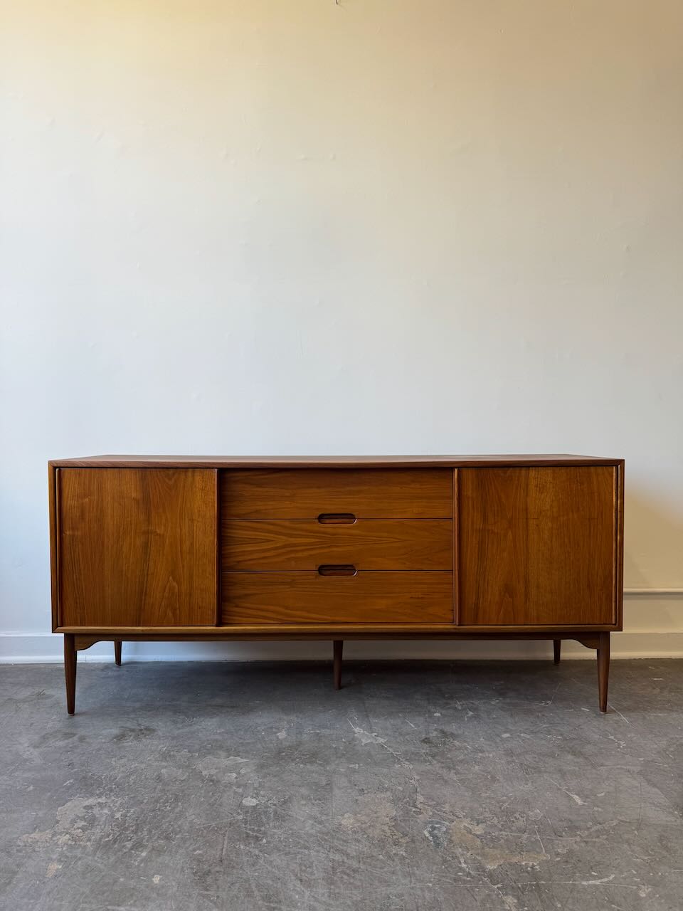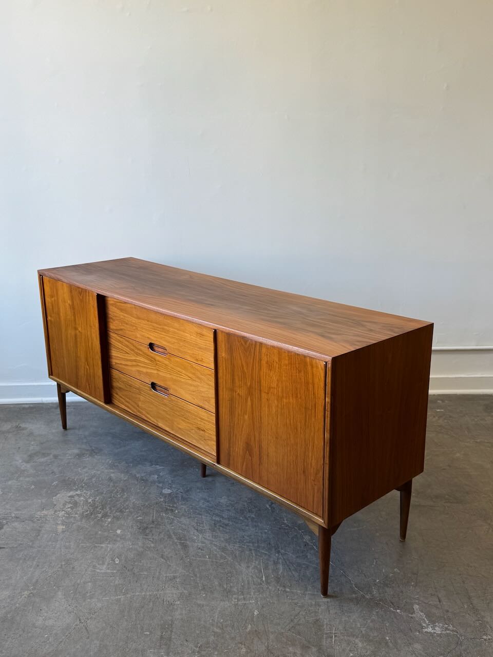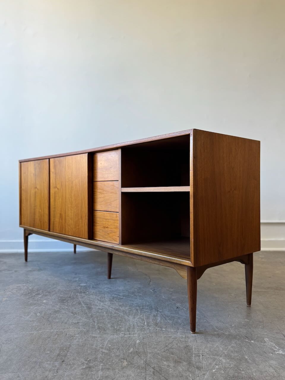 A stunning Mid-Century Modern credenza by John Keal for Brown-Saltman! This vintage gem is in great condition and boasts both style and substance. With generous storage and functionality thanks to its central drawers and side cabinets, it offers the perfect solution for media storage or a dining room sideboard. It embodies that classic mid-century design we all love, featuring warm walnut tones and tapered legs.