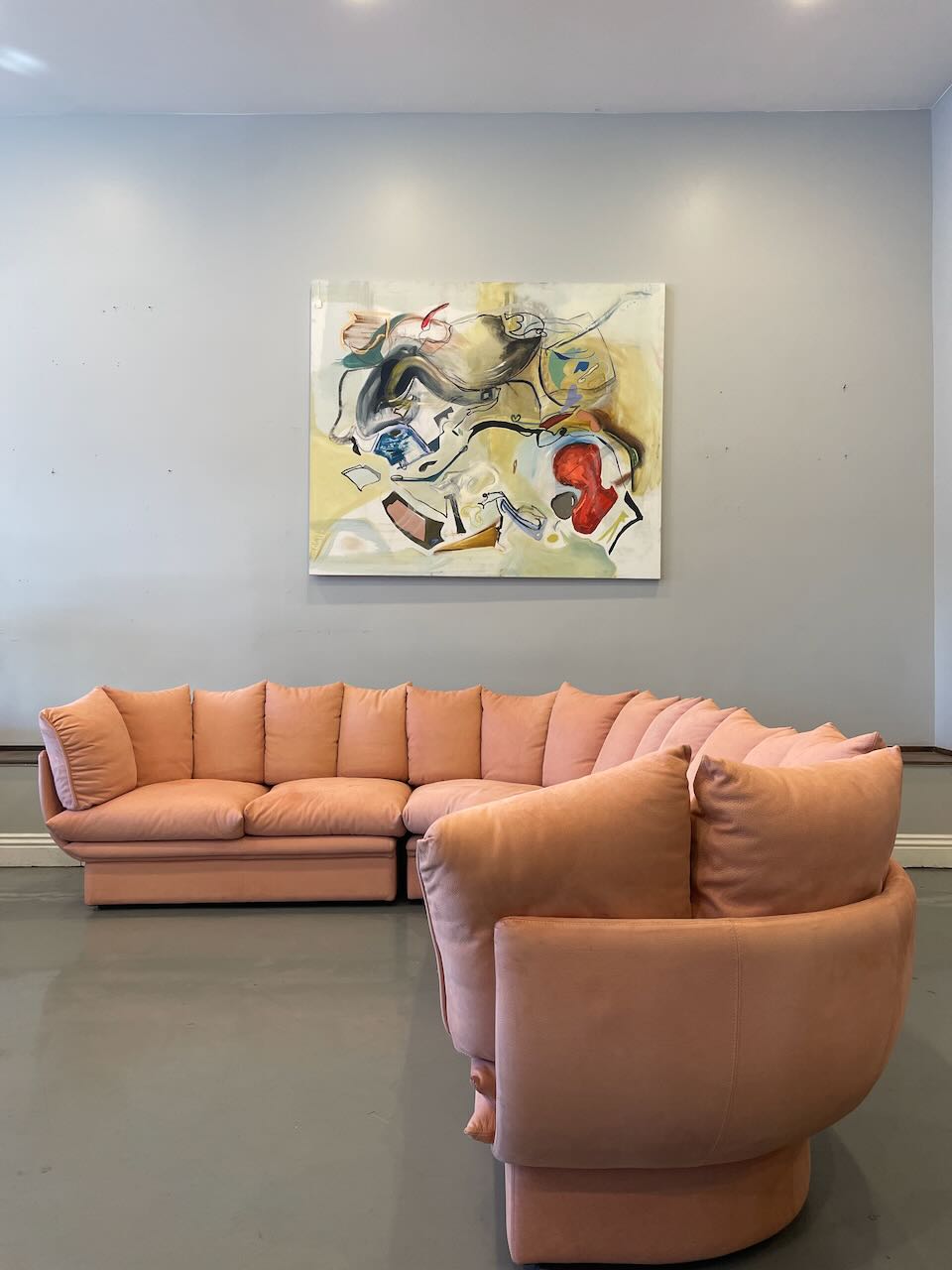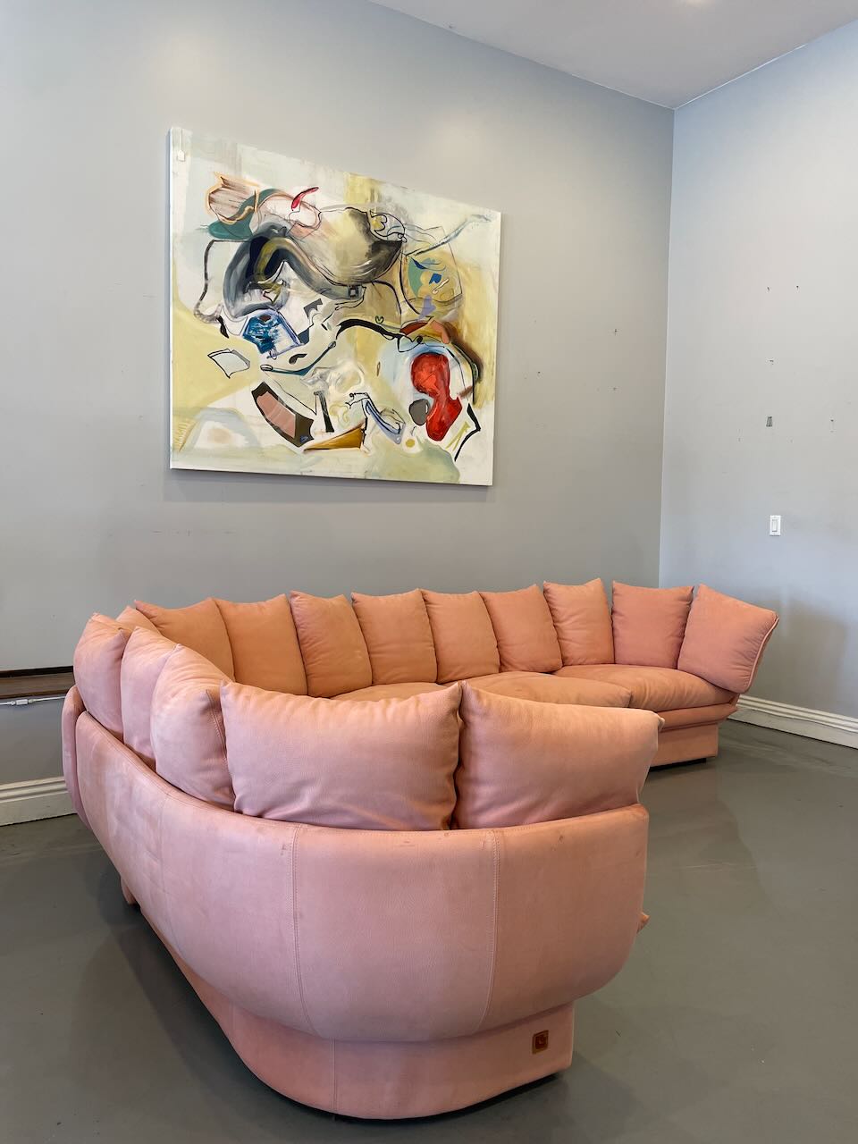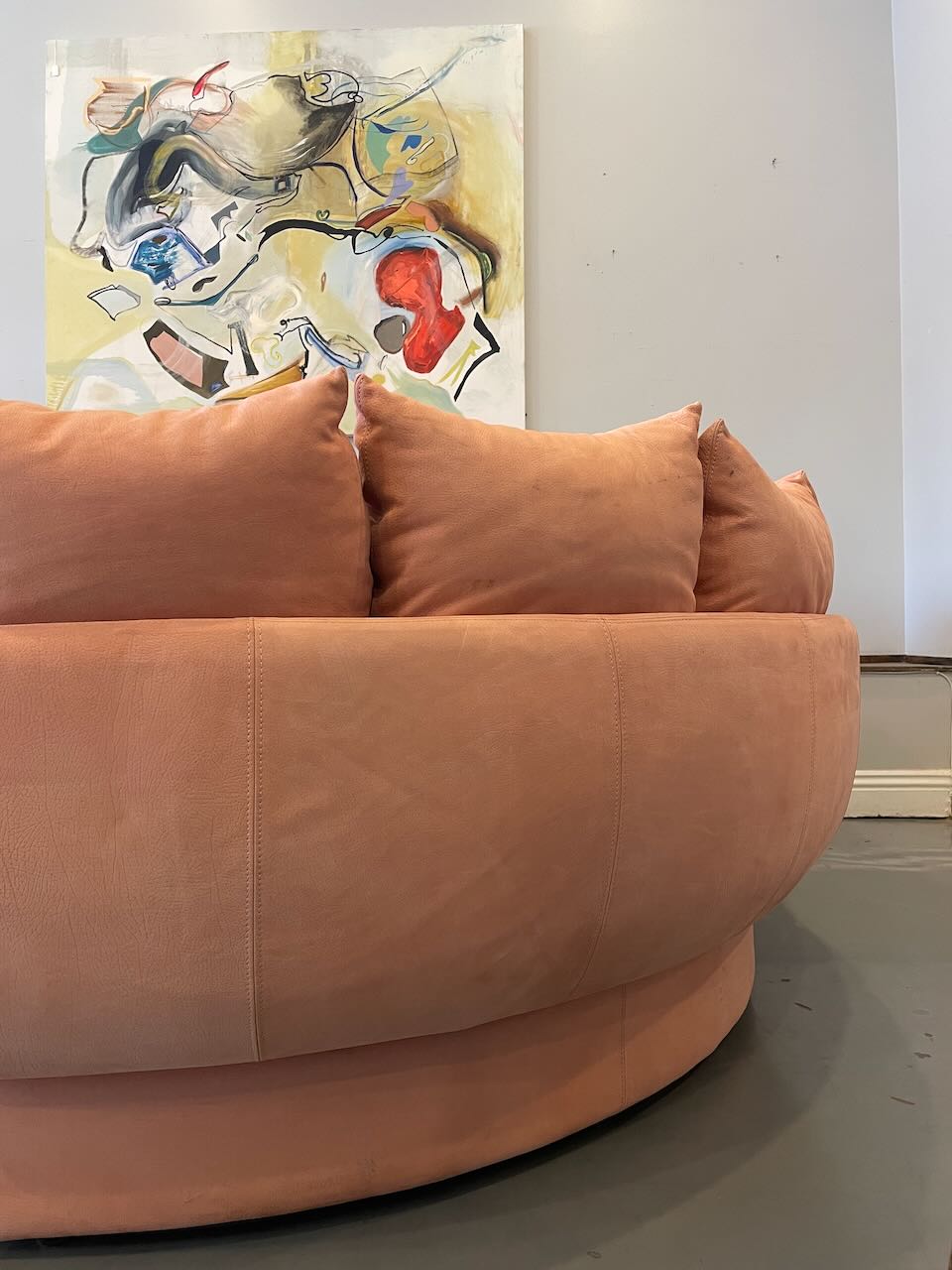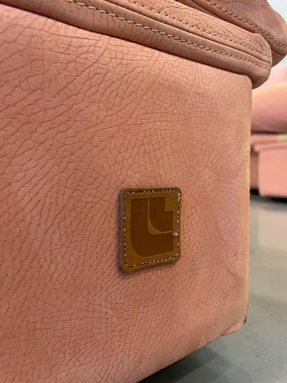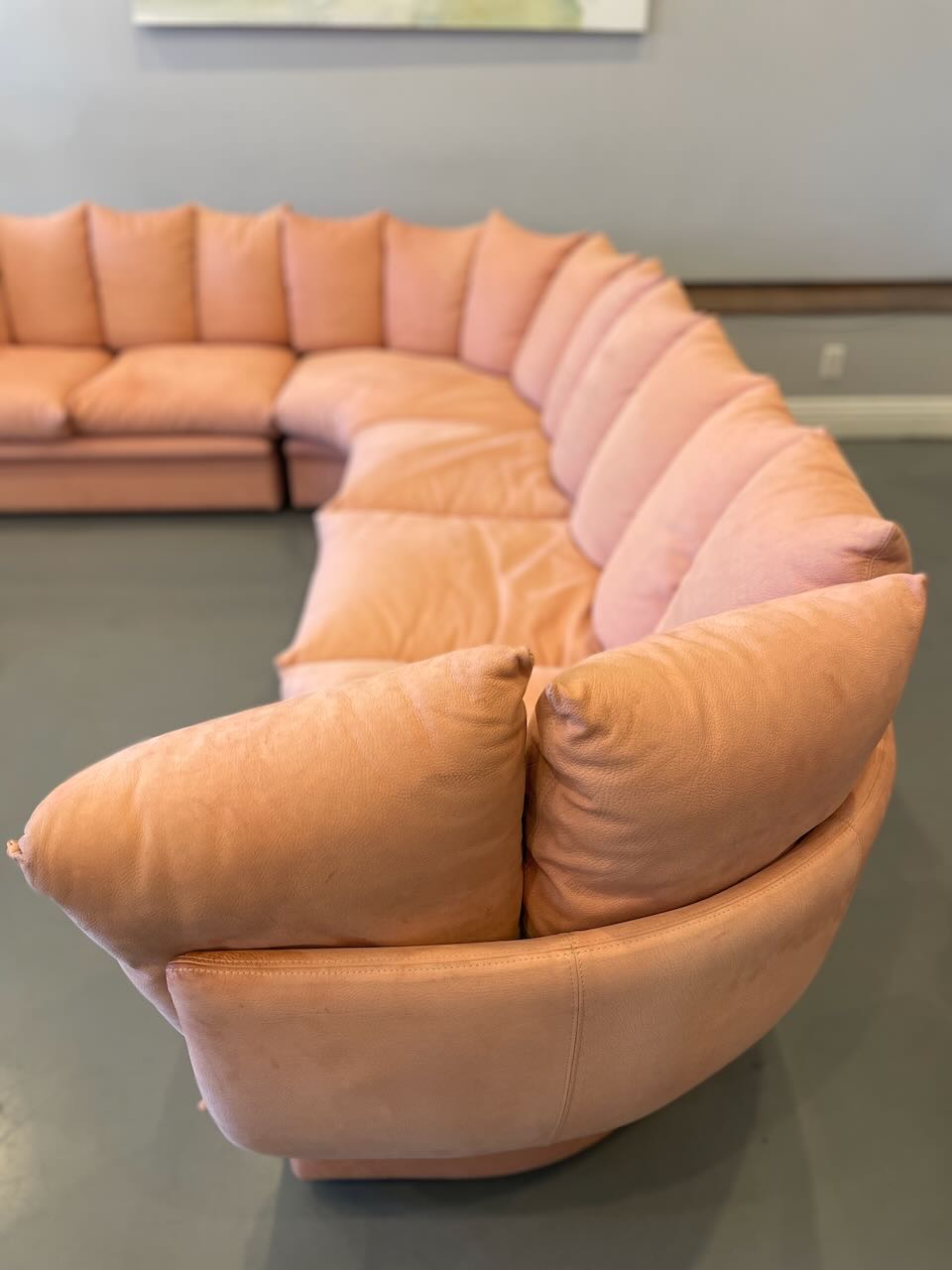 Stunning postmodern Italian sectional sofa by LEV & LEV of Italy. Wrapped in the dreamiest soft nubuck leather, blush / dusty peach, this piece is all about curves, comfort, and quiet luxury. Sculptural, oversized, and incredibly inviting — the kind of sofa that pulls you in and makes you want to stay awhile. High-end craftsmanship, beautiful proportions, and pure postmodern energy. One of those pieces you don’t see every day.