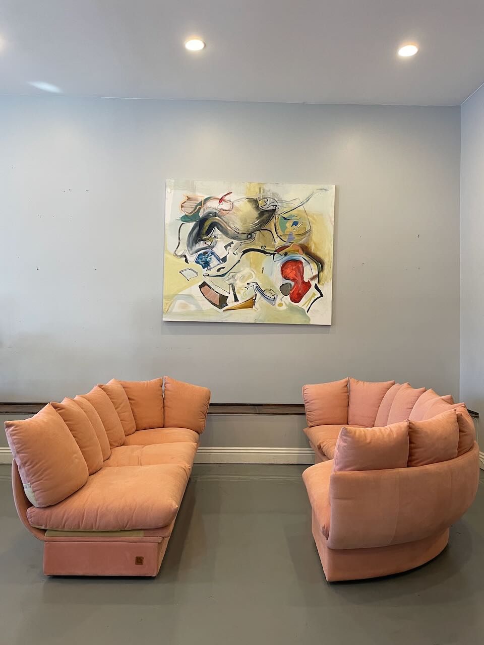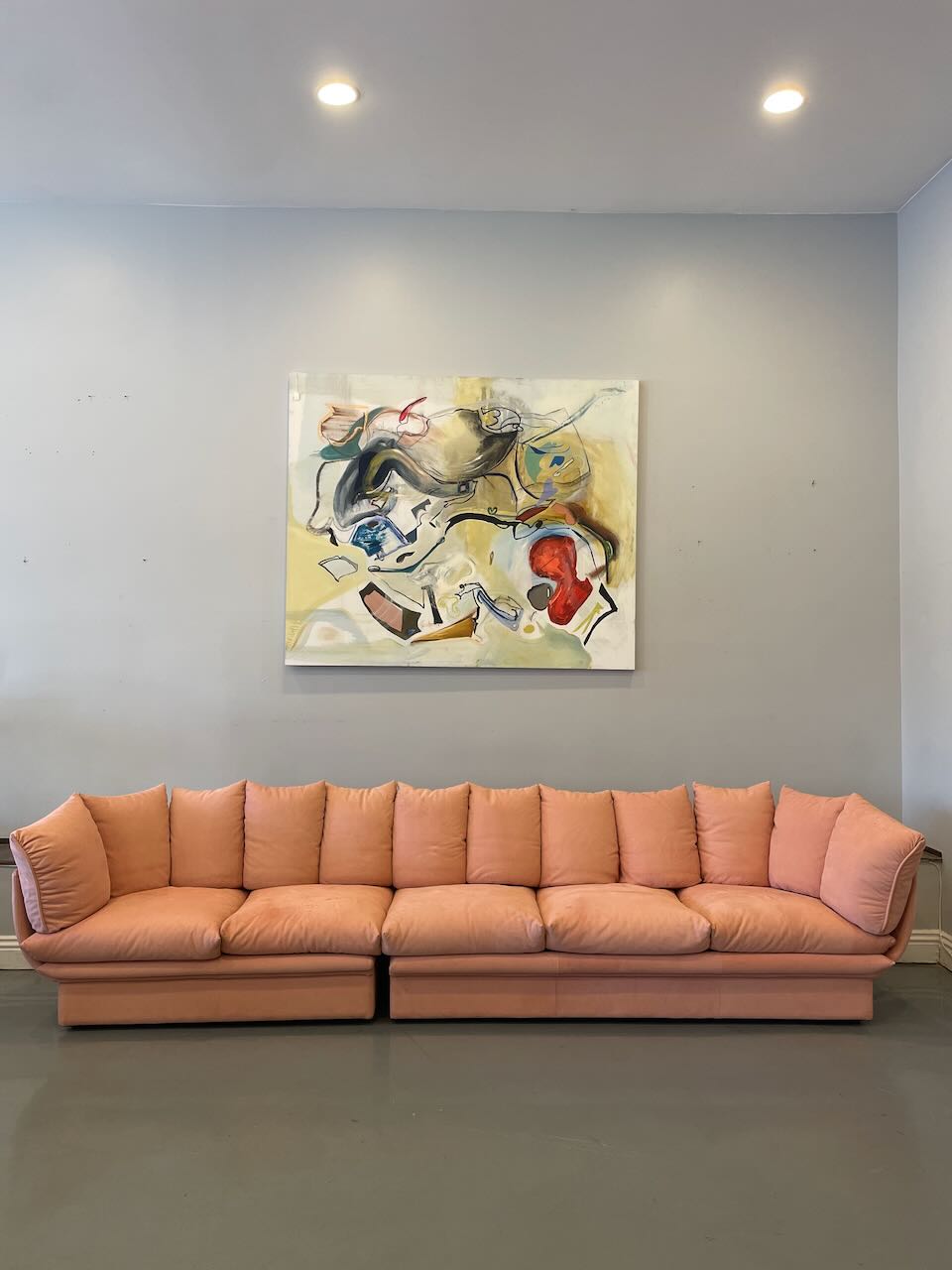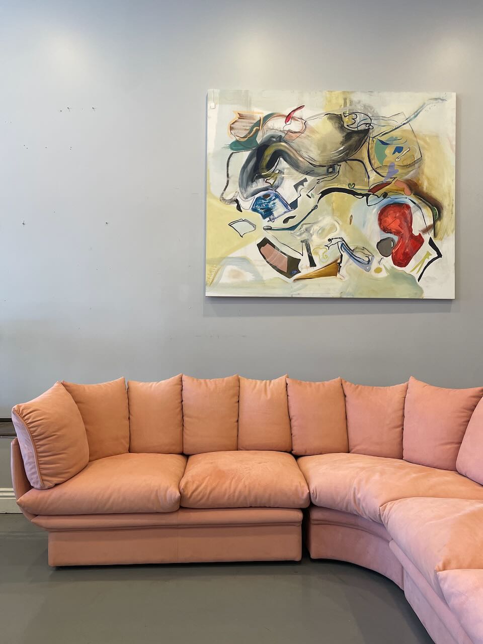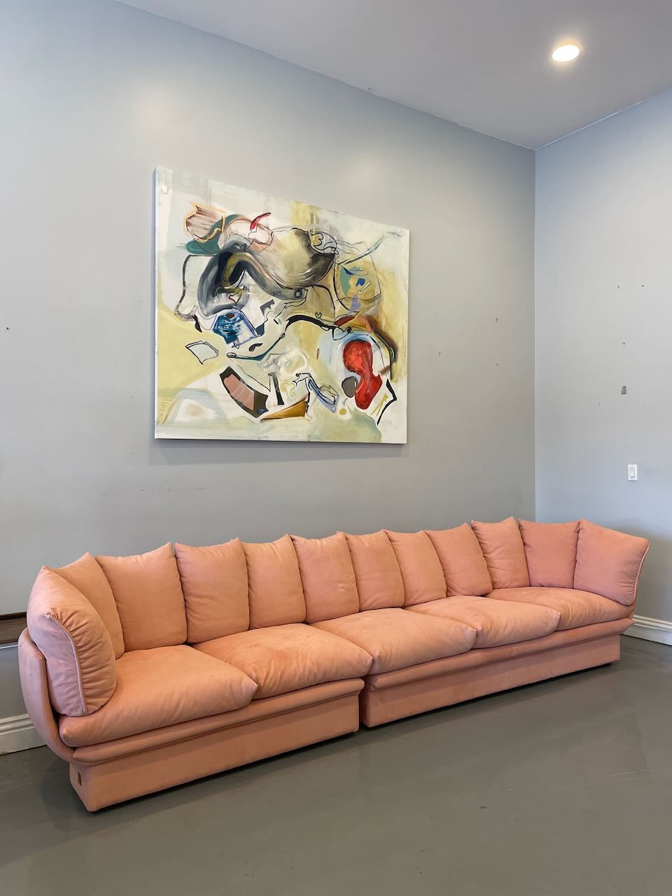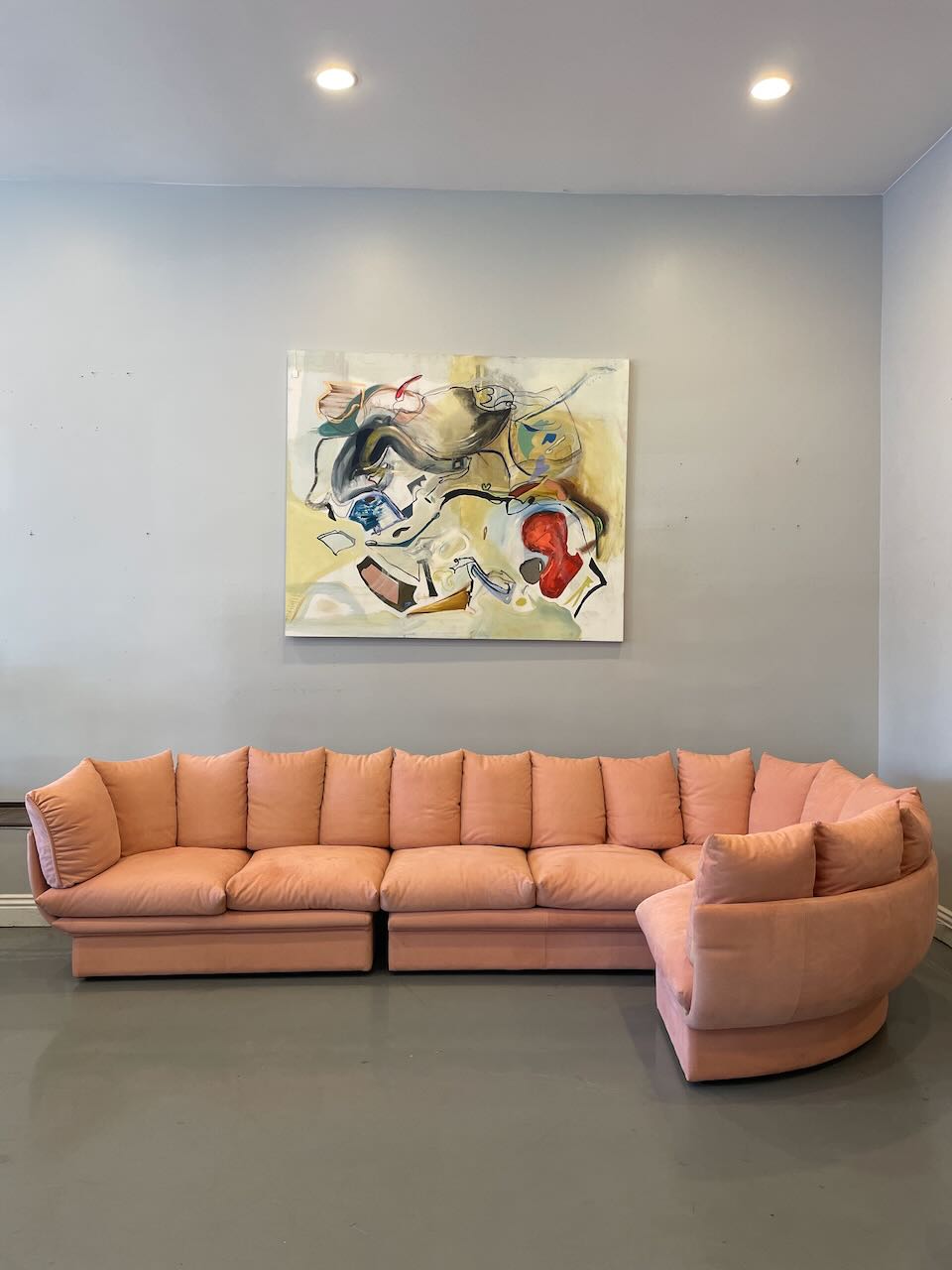 Stunning postmodern Italian sectional sofa by LEV & LEV of Italy. Wrapped in the dreamiest soft nubuck leather, blush / dusty peach, this piece is all about curves, comfort, and quiet luxury. Sculptural, oversized, and incredibly inviting — the kind of sofa that pulls you in and makes you want to stay awhile. High-end craftsmanship, beautiful proportions, and pure postmodern energy. One of those pieces you don’t see every day.