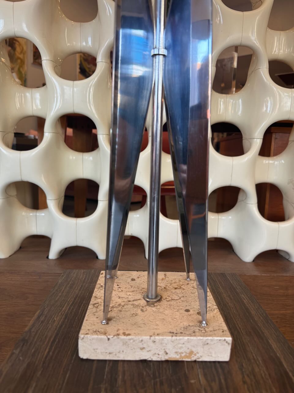 A rare find with a bold vision. This Futurist Maurizio Tempestini lamp is a study in form, function, and unparalleled style. The travertine base and the chrome form is in great condition with no wear.
