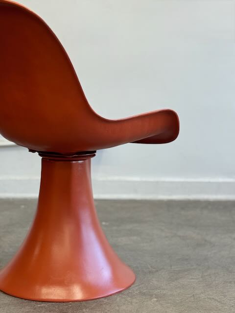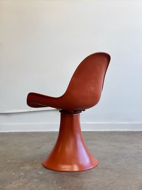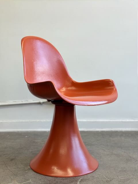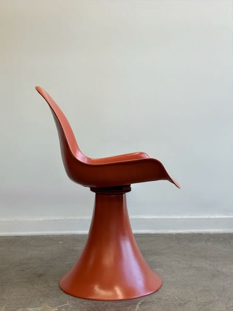 We have a beautifully designed “Space age” era fiberglass accent swivel chair. Dating to the late 60’s-70’s this chair features a timeless and classic tulip base with an ergonomic seat and back shaping and fitting perfectly to your body. The swivel mechanism works smooth and really does make moving around while working a breeze. We are loving everything about this chair. It makes for the perfect desk chair or simply an accent chair that fits in to just about any space. Newly repainted in a vibrant semi-gloss pop of burnt orange. Don’t miss out on this gem.
