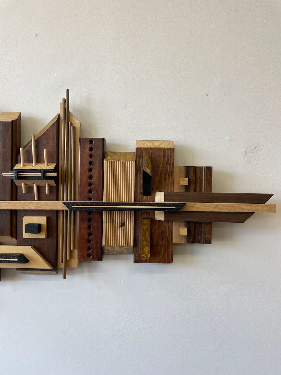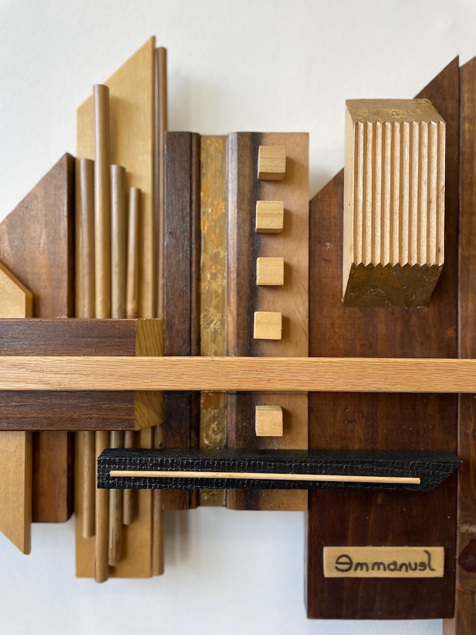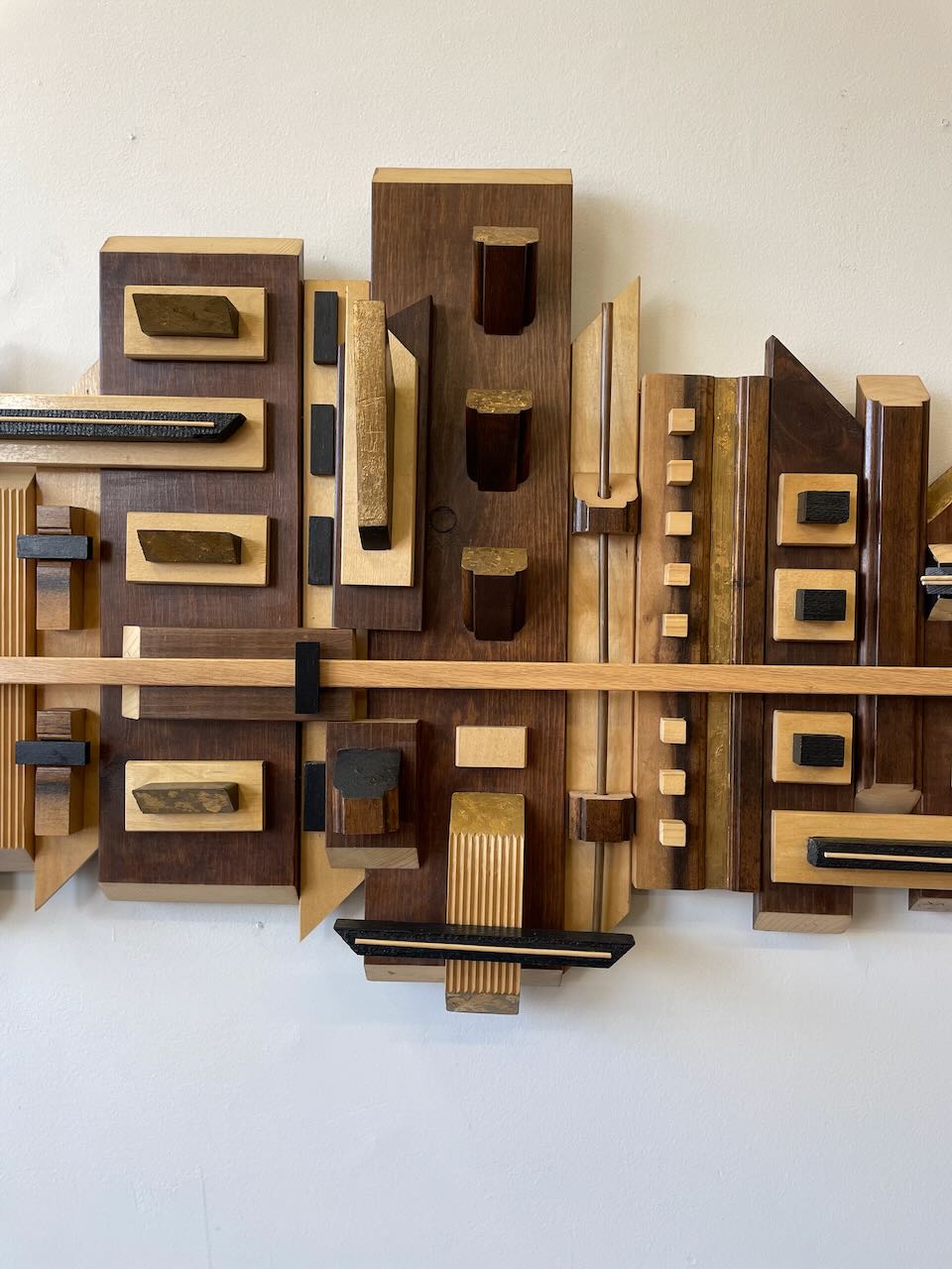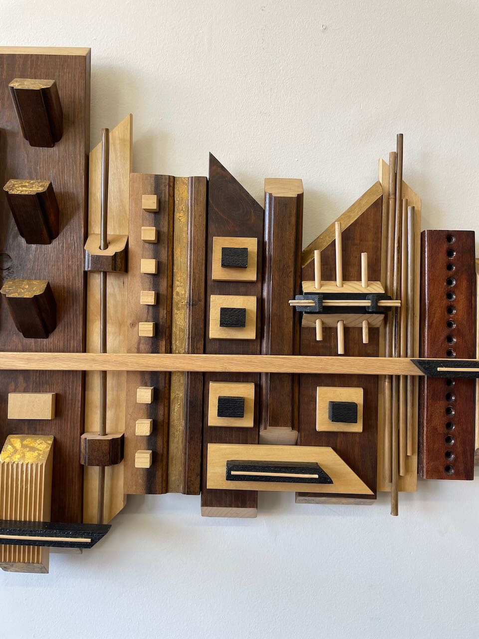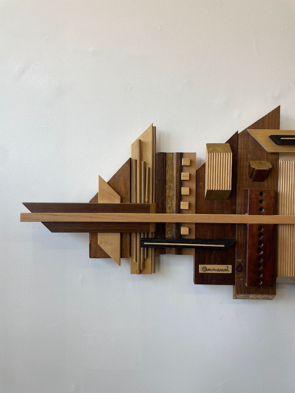 This wood wall hanging sculpture is by local artist Emmanuel de la Paz Ramirez. Very beautiful tones of wood and gold accents, brutalist as well as the skyscraper design, this piece would be a great addition to any space.