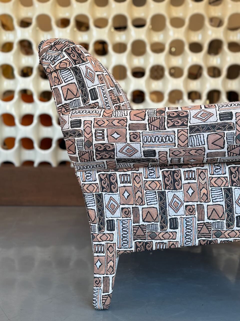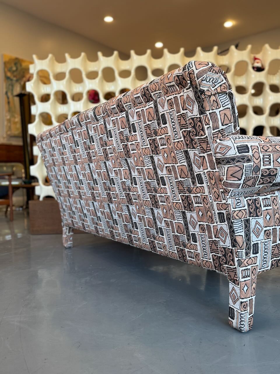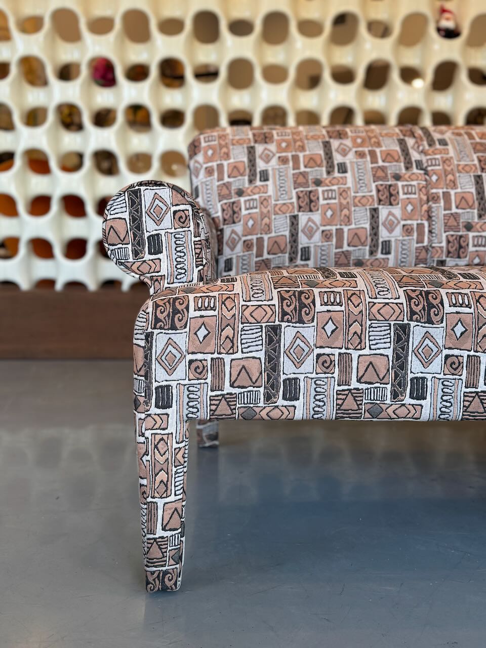 Funky, quirky, and ready for its next life! This amazing post-modern 3-seater sofa has just been newly cleaned and is in great condition. The distinct pattern upholstery is everything, but reupholstery is always an option if you don’t dig this vibe as much as we do. We’re obsessed with the upholstered legs and the incredibly comfortable original springs that are still to die for. This piece is extremely comfortable and ready to bring some personality into your space!