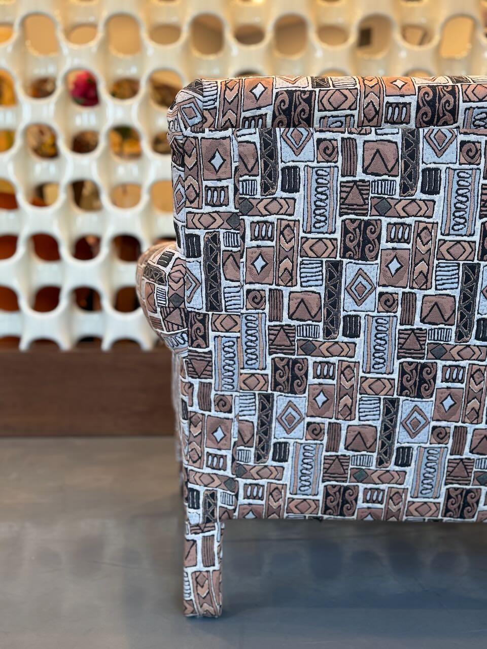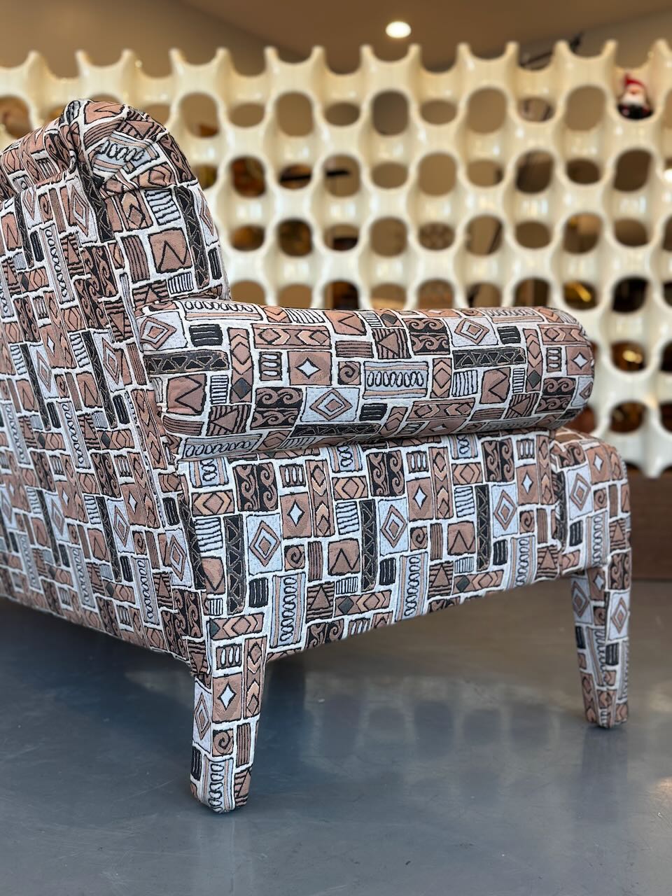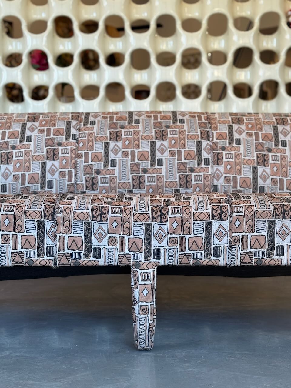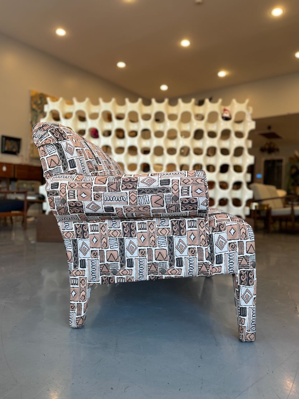 Funky, quirky, and ready for its next life! This amazing post-modern 3-seater sofa has just been newly cleaned and is in great condition. The distinct pattern upholstery is everything, but reupholstery is always an option if you don’t dig this vibe as much as we do. We’re obsessed with the upholstered legs and the incredibly comfortable original springs that are still to die for. This piece is extremely comfortable and ready to bring some personality into your space!