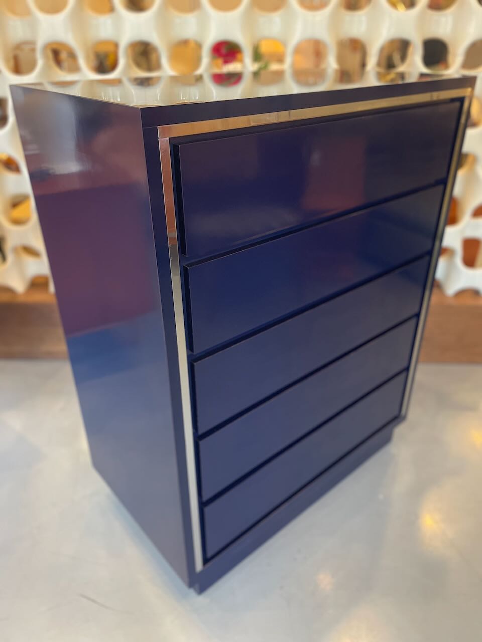 This vintage postmodern tall dresser blends clean lines with bold style. Crafted from laminated deep navy lacquer and framed with chrome metal trim, it has a modern, sculptural look while still feeling warm and vintage. The recessed drawer fronts keep the design minimal and sleek. Five spacious drawers glide smoothly with natural wood interiors, giving you plenty of storage without losing the clean aesthetic. Great for a bedroom, entry, or any space that needs a statement piece with a modern vibe.