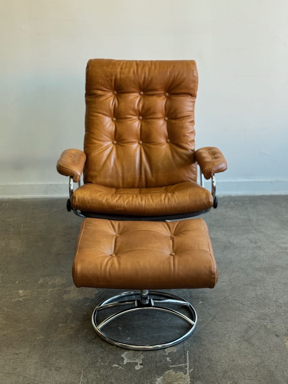 Check out this absolutely gorgeous, perfectly vintage Ekornes Stressless recliner and ottoman set. This isn’t just a chair it’s a 1970s icon! If you’re looking for genuine mid-century modern style that delivers unmatched comfort, this is it. 🛋️ The rich, butterscotch-brown button-tufted leather paired with that flawless circular chrome base is dynamite. Known for legendary Norwegian comfort, this swivels, reclines, and makes every other seat in the room jealous.