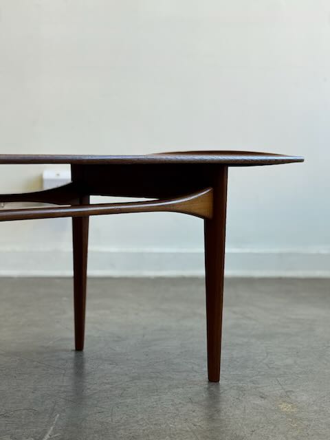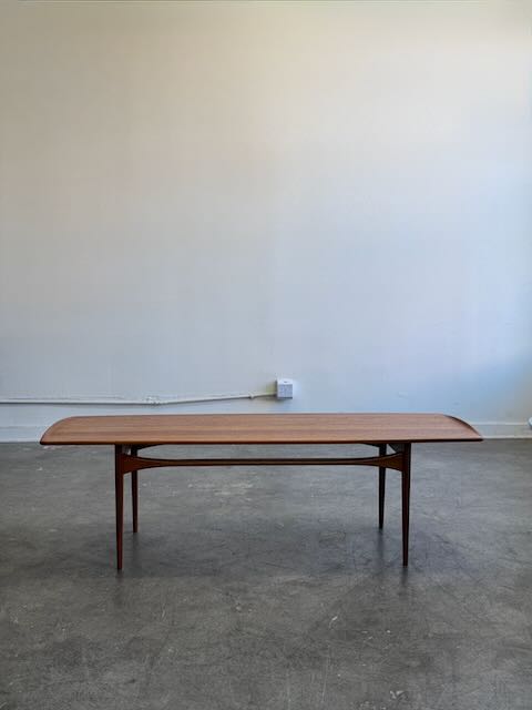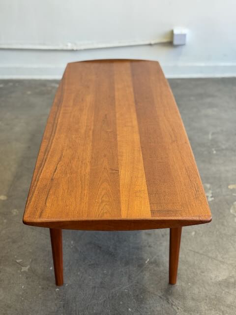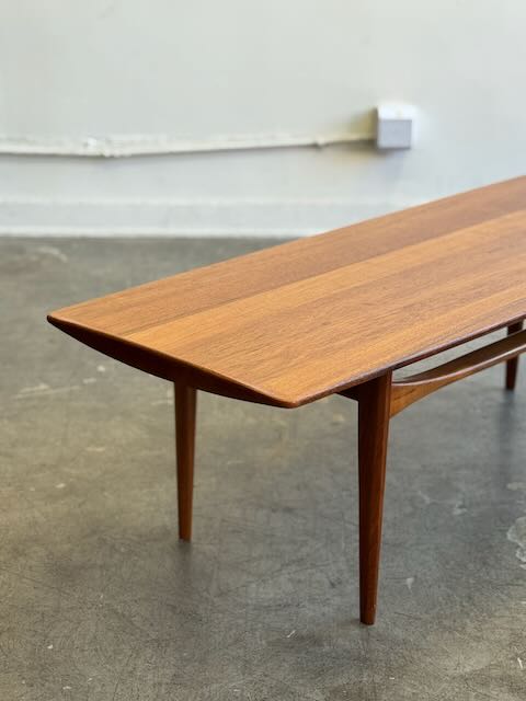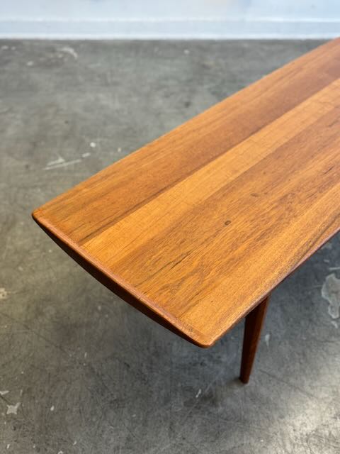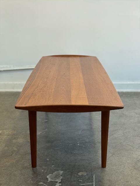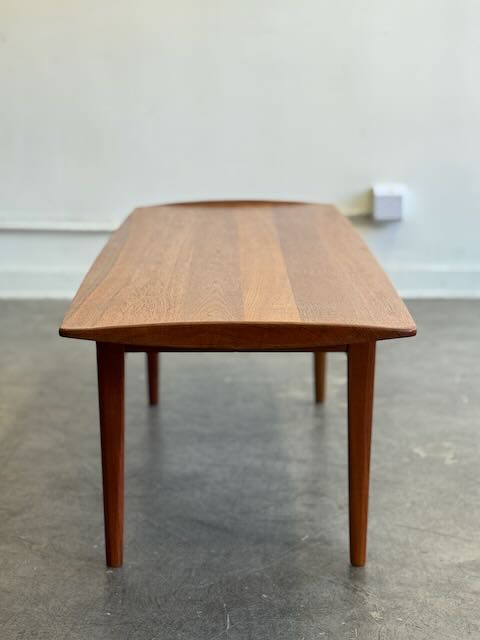 This table is striking to say the least. A beautifully produced Danish modern coffee table dating to the 1960’s in solid teakwood with a variation of tones and grain. Not too often do you see an amazing duo of both personal and business partners. Tove and Edvard Kindt-Larsen designed this stunning table and France & Son executed the design to perfection. Consisting of solid teak planks jointed with a crazy sculptural detail to the opposite ends and base. Everything about this table is a true testament to the timeless and iconic Scandinavian mid century design that has taken the world by storm. This genuine gem had its subtle surfboard shaped top restored and shined up. A great size for that beautiful living room or lounge.