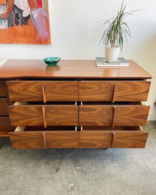 This stunning long and curvy Mid-Century Modern dresser by United Furniture is crafted in rich walnut with a striking wood grain. It offers a total of nine drawers, including a left-hand door with a sculptural curved detail and additional drawers featuring bold sculpted handles. Raised on tapered legs, this piece showcases the quality craftsmanship and solid construction United is known for—built to last and designed to impress.