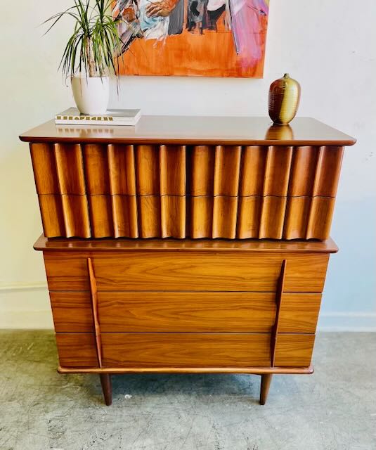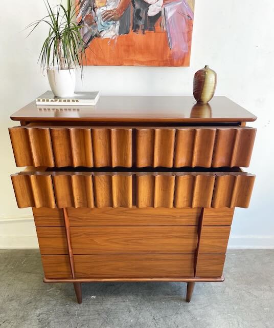 This elegant tall Mid-Century Modern dresser by United Furniture is crafted in rich walnut with a striking wood grain. The design features a unique curved two-drawer wavy front at the top, paired with three spacious drawers below for plenty of storage. Resting on tapered legs, this piece highlights the sculptural detail and expert craftsmanship you can expect from United Furniture—beautiful, functional, and built to last.