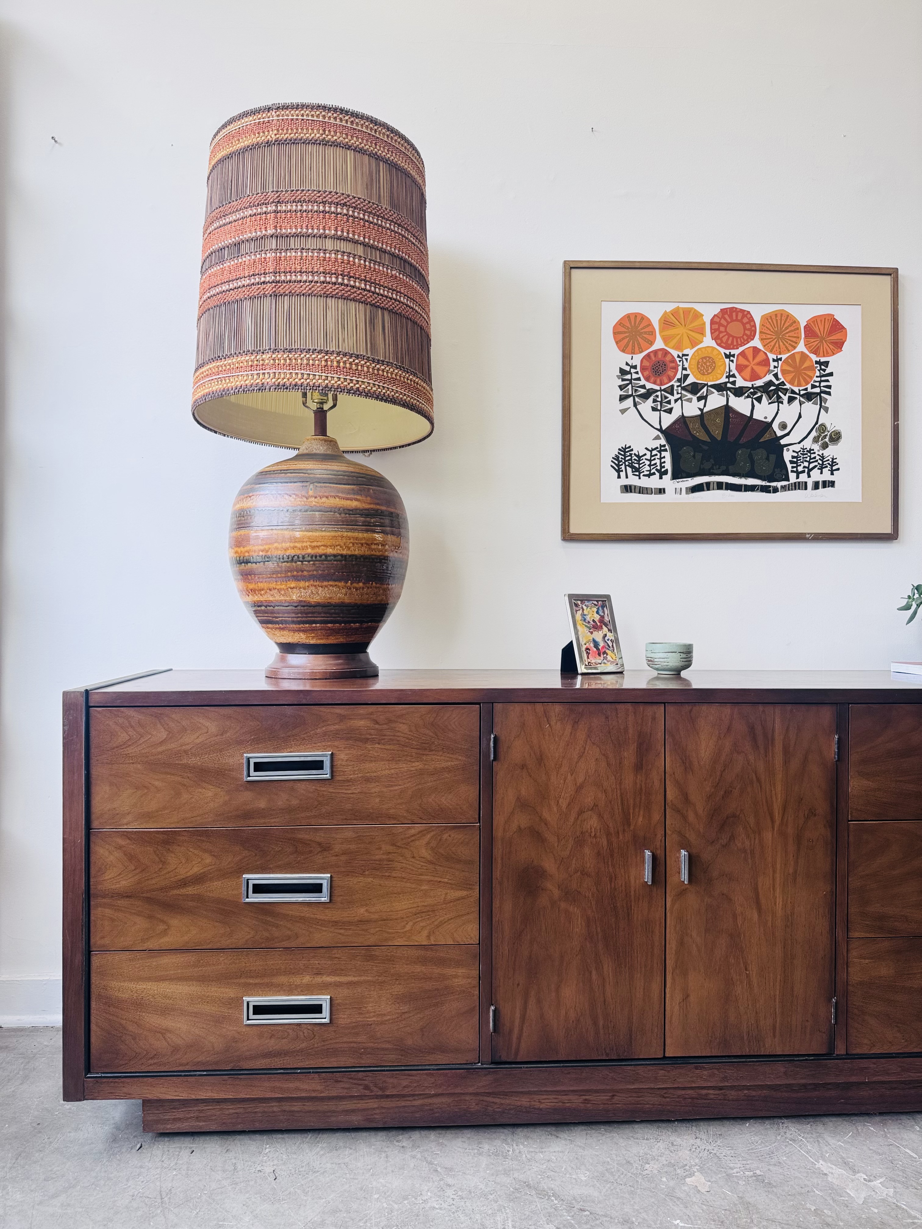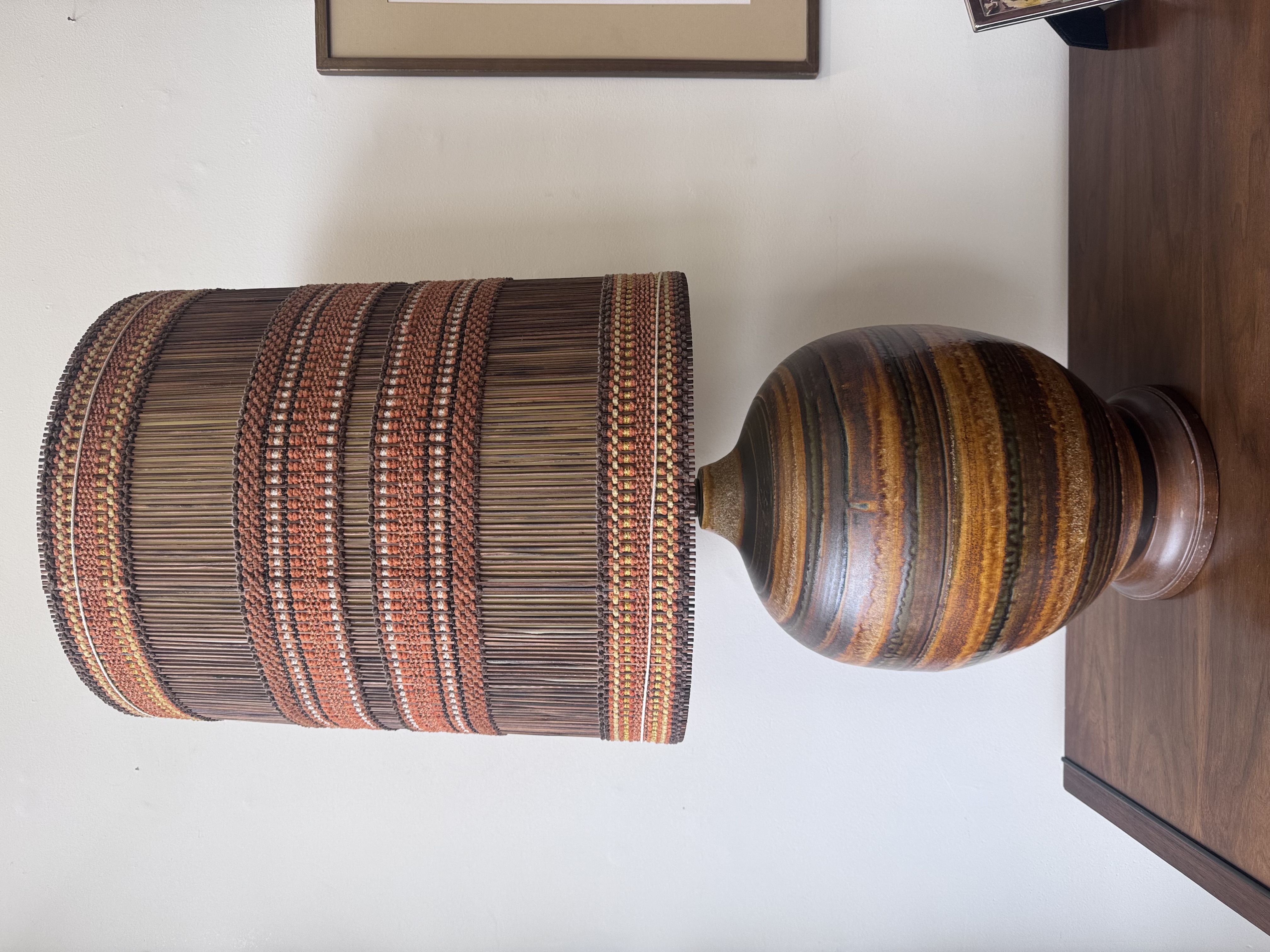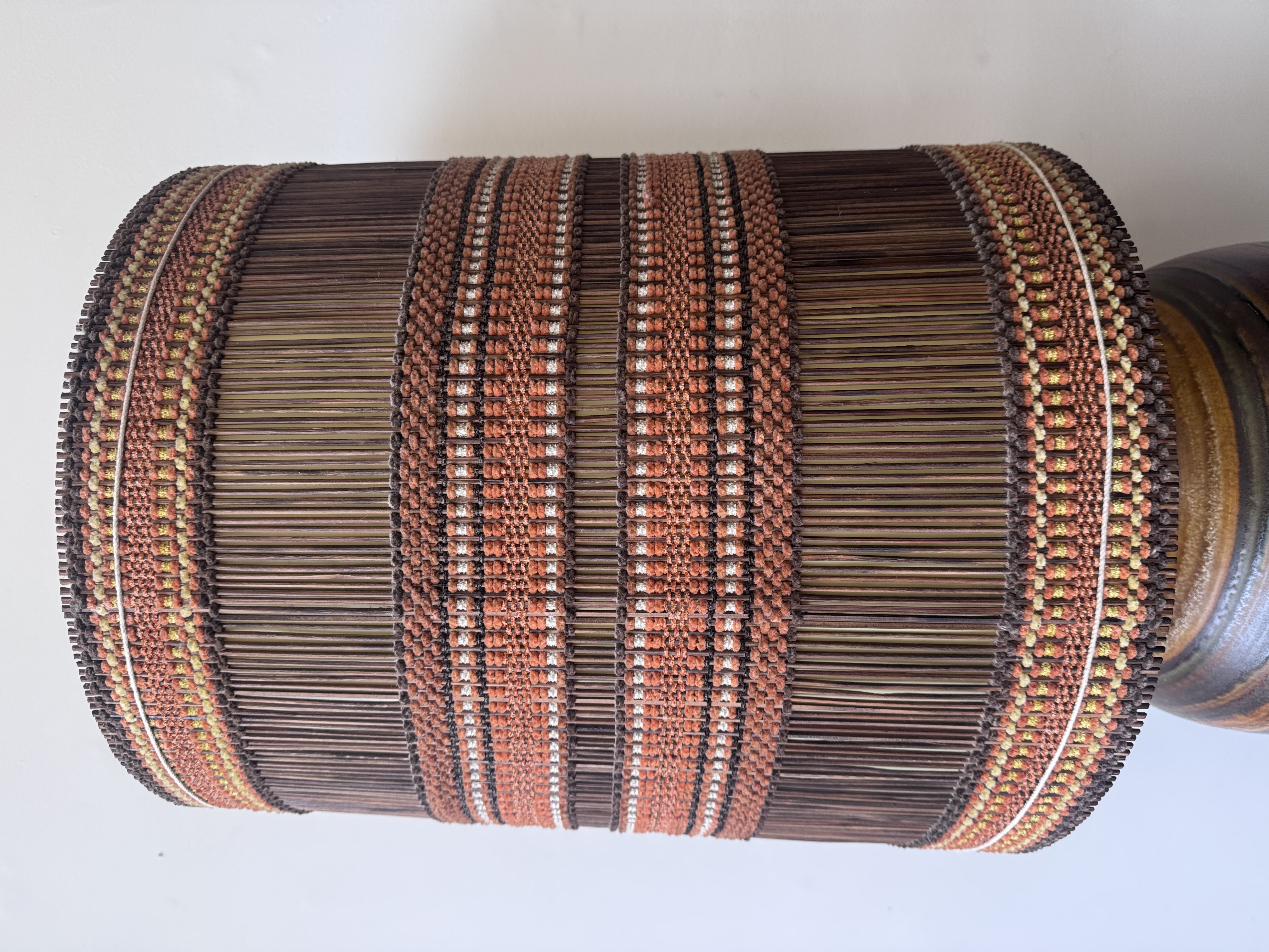Vintage Mid-Century Modern table lamp featuring a beautifully textured woven shade by California textile artist Maria Kipp. The handcrafted shade showcases rich earth tones and intricate woven detail, perfectly paired with a sculptural ceramic base finished in a warm brown and amber drip glaze. A striking blend of texture, craftsmanship, and classic mid-century California design—both functional and collectible.